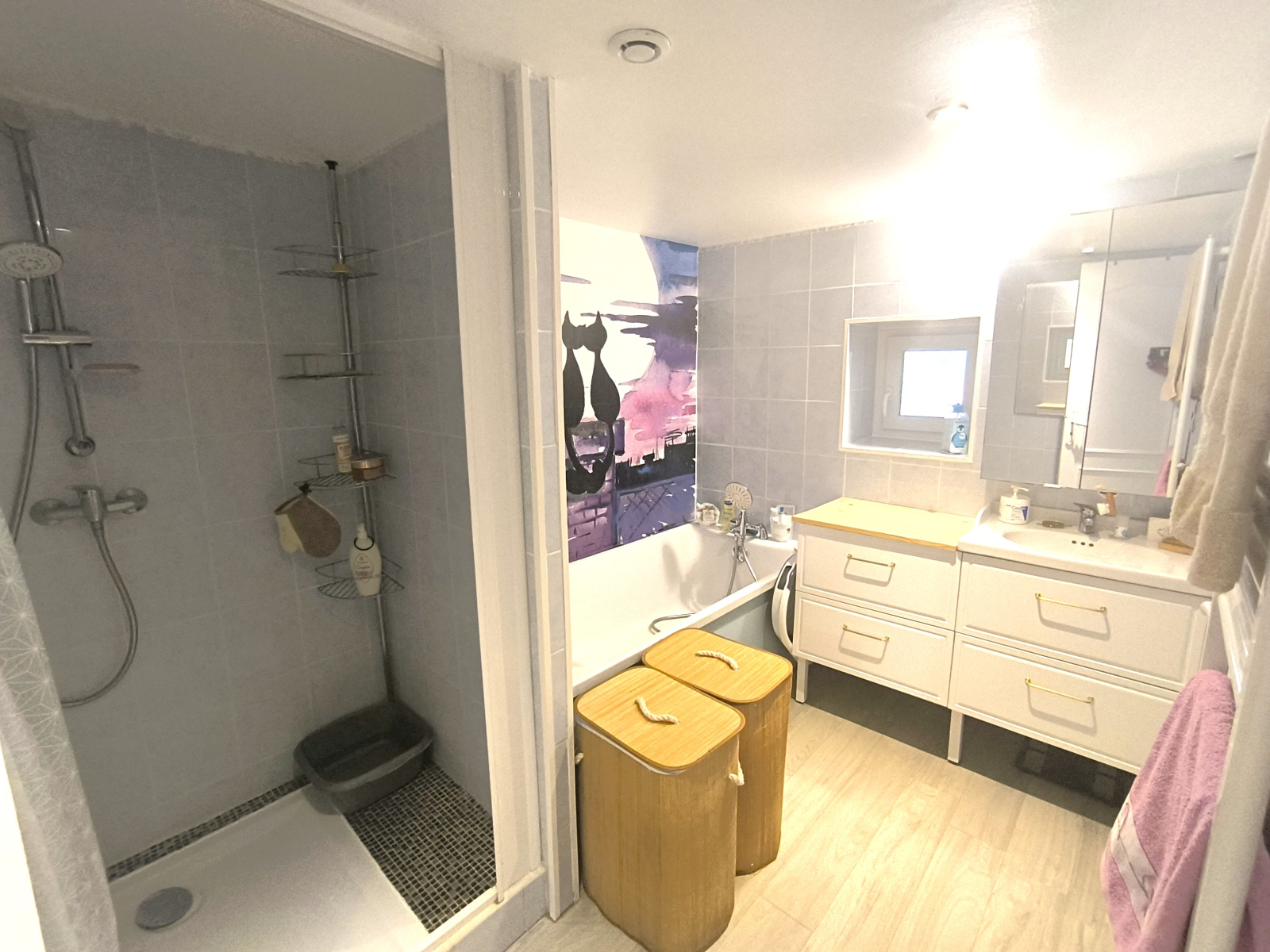 Au rez-de-chaussée, vous découvrirez une agréable pièce de vie lumineuse avec cuisine équipée, une salle de bains avec douche ainsi qu’un WC.