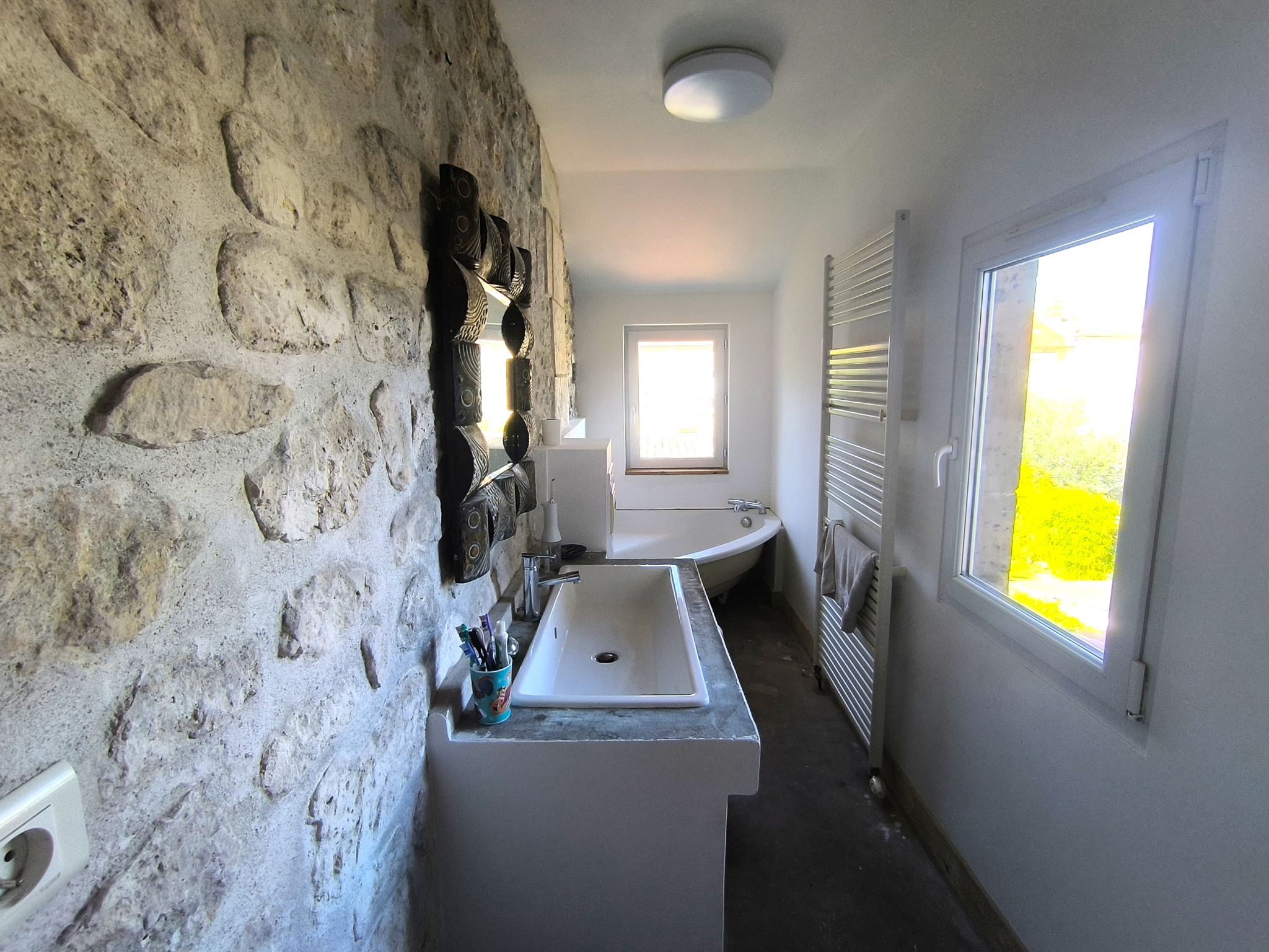 Le premier étage offre une grande chambre avec sa salle de bain et WC privatifs.