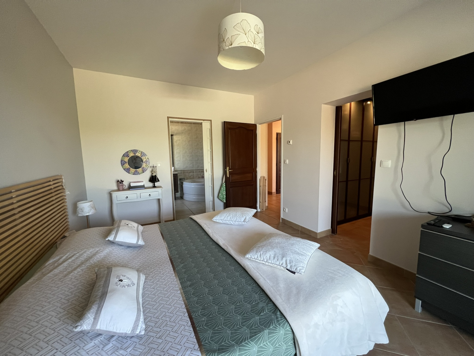 Cette maison est équipée de tout le confort du moderne que l'on peut rechercher (pompe à chaleur, chauffage au sol, chauffe eau alimenté par des panneaux solaires, adoucisseur d'eau).
