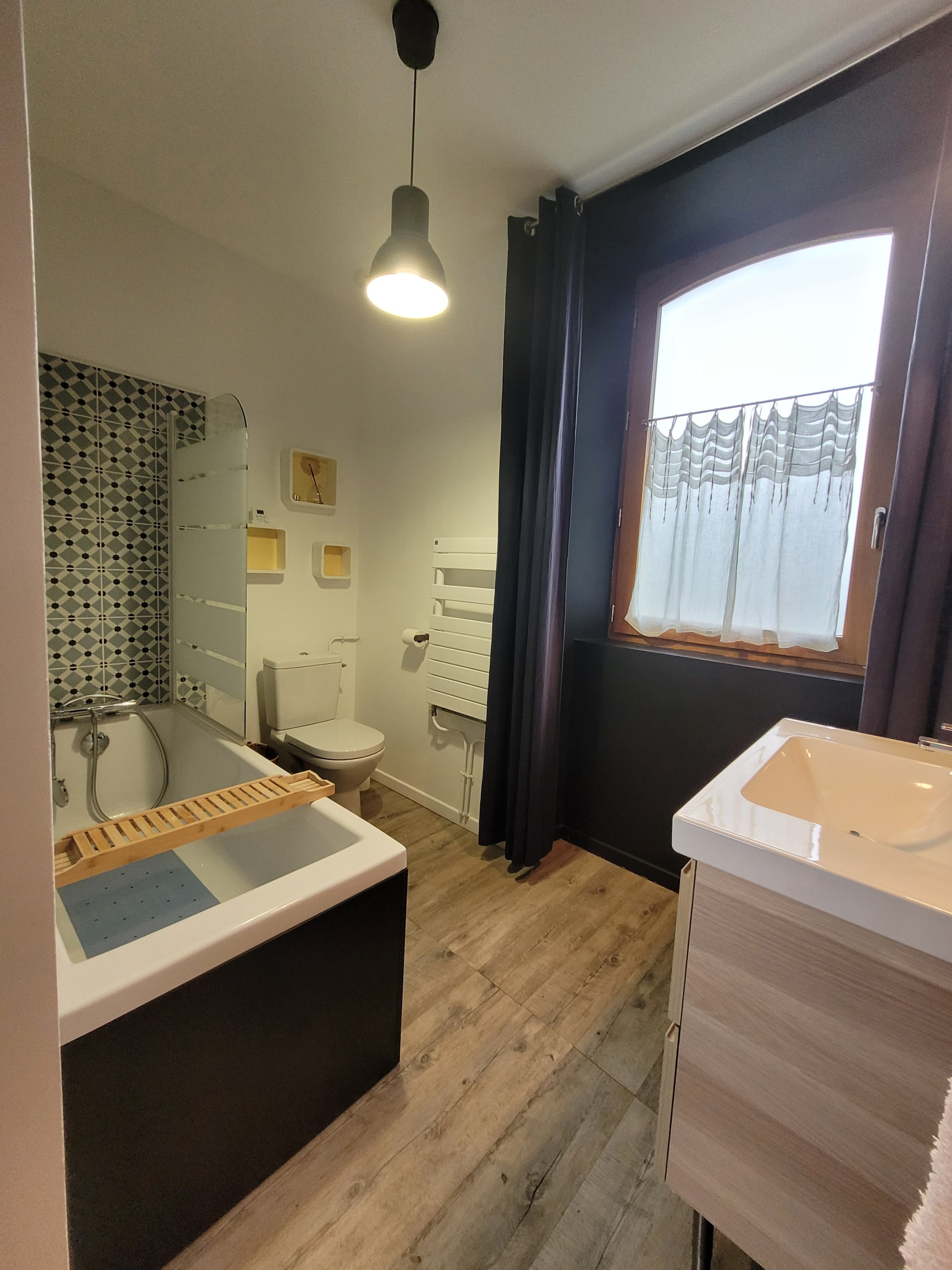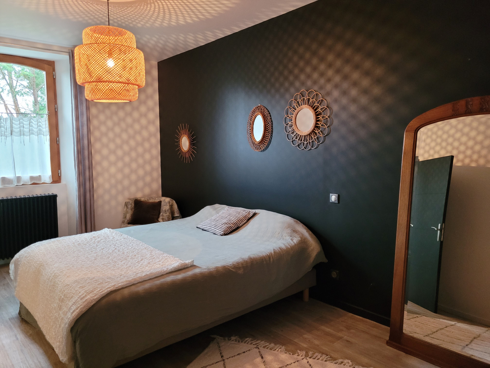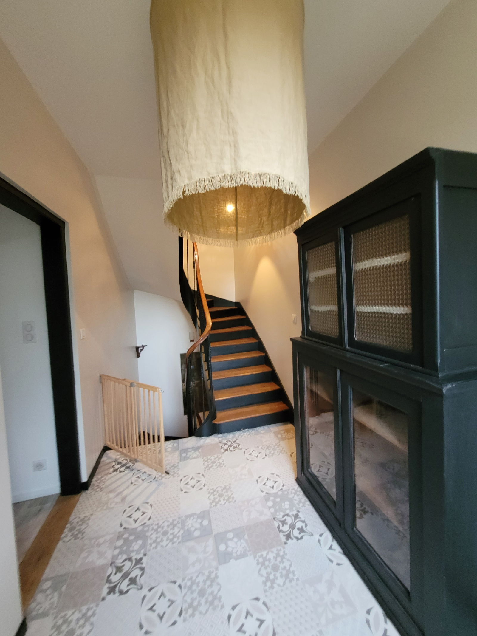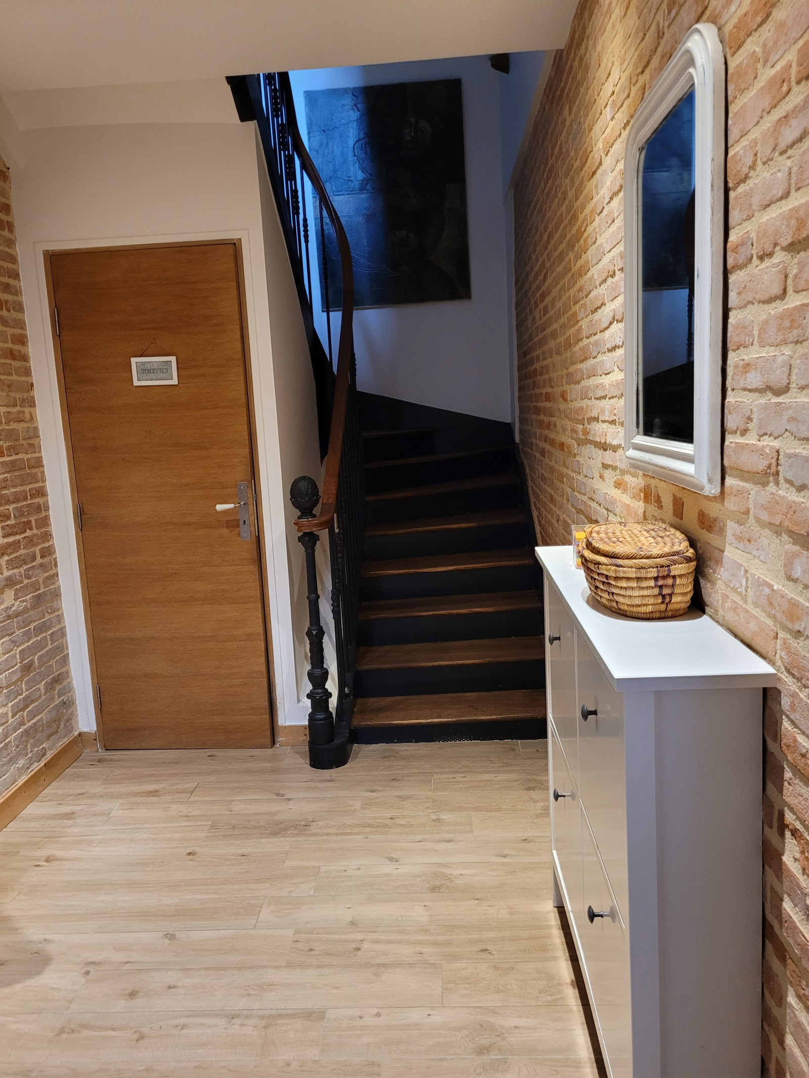 Un superbe escalier d'origine permet l'accés au premier étage. Un Hall d'accueil. A droite, de celui-ci, un espace avec 2 chambres, salle de bains et WC. De l'autre côté un grand espace suite parentale avec salon-bureau, chambre avec grand dressing (Perene) espace pour chacun, bibliothèque et salle d'eau WC privatifs. Un élément d'époque est caché dans la suite (je garde la surprise pour la visite)