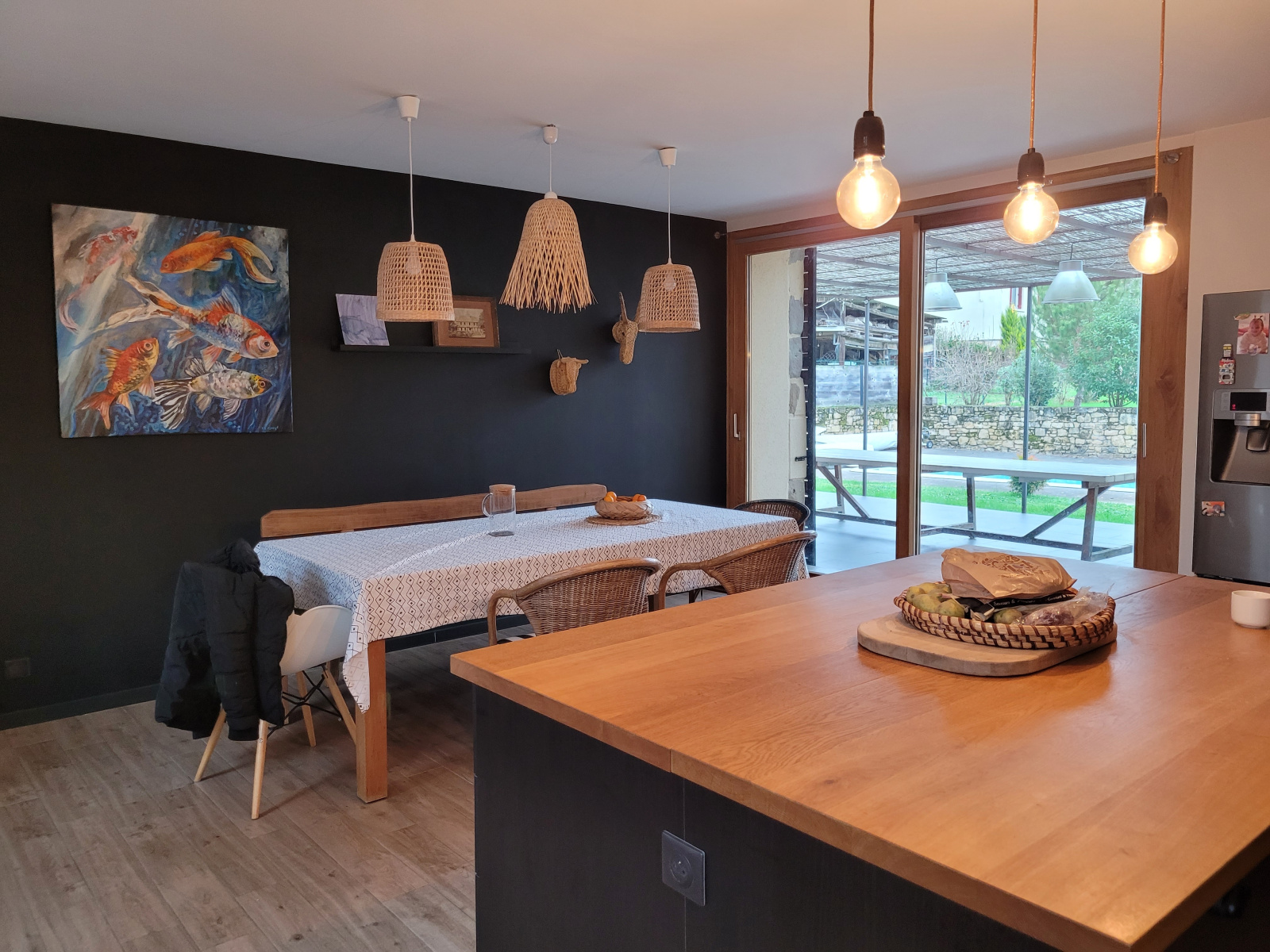 En rez de chaussée : hall d'accueil, cuisine équipée ouverte sur espace repas de 33m2 : l'on a envie de s'installer et de savourer de bons plats en famille ou entre amis. Accés terrasse d'environ 40 m2 avec vue piscine et jardin. De grands moments à partager en perspective... Une buanderie attenante.