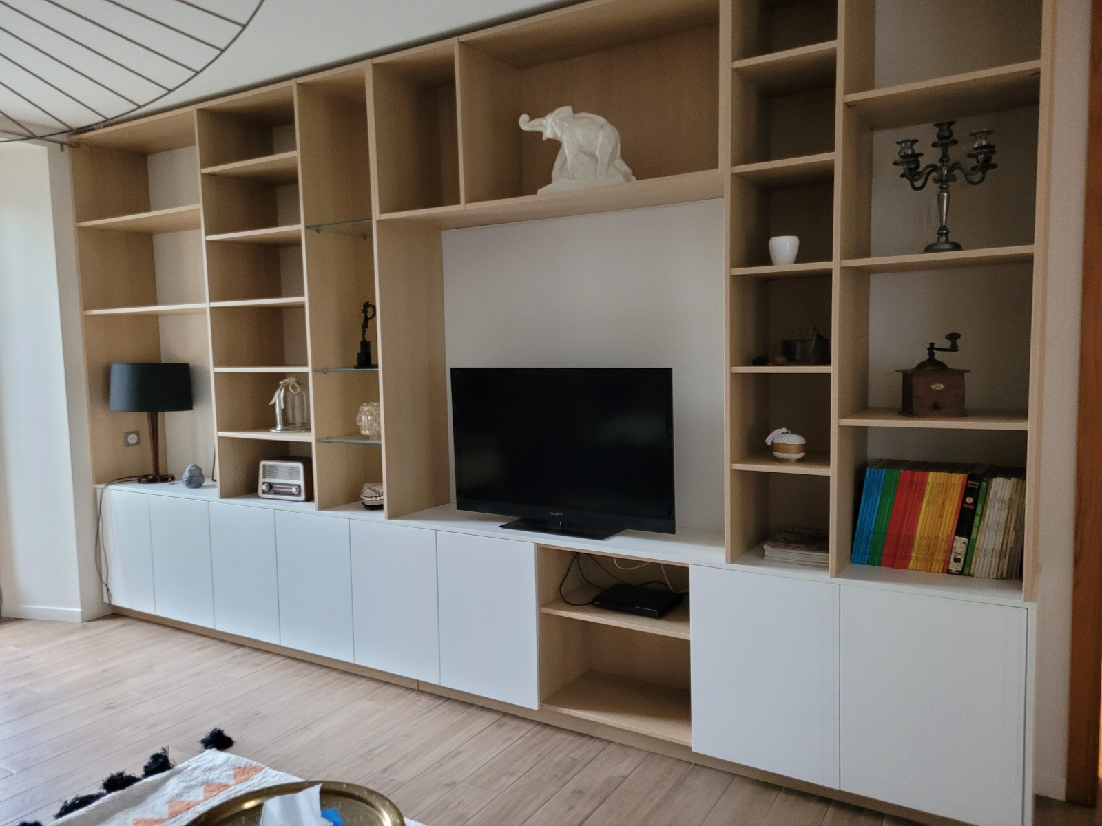Et si nous passions au séjour? Un nouvel espace lumineux à investir de plain -pied 33m2 avec cheminée et bibliothèque.