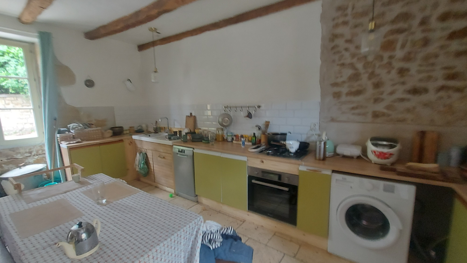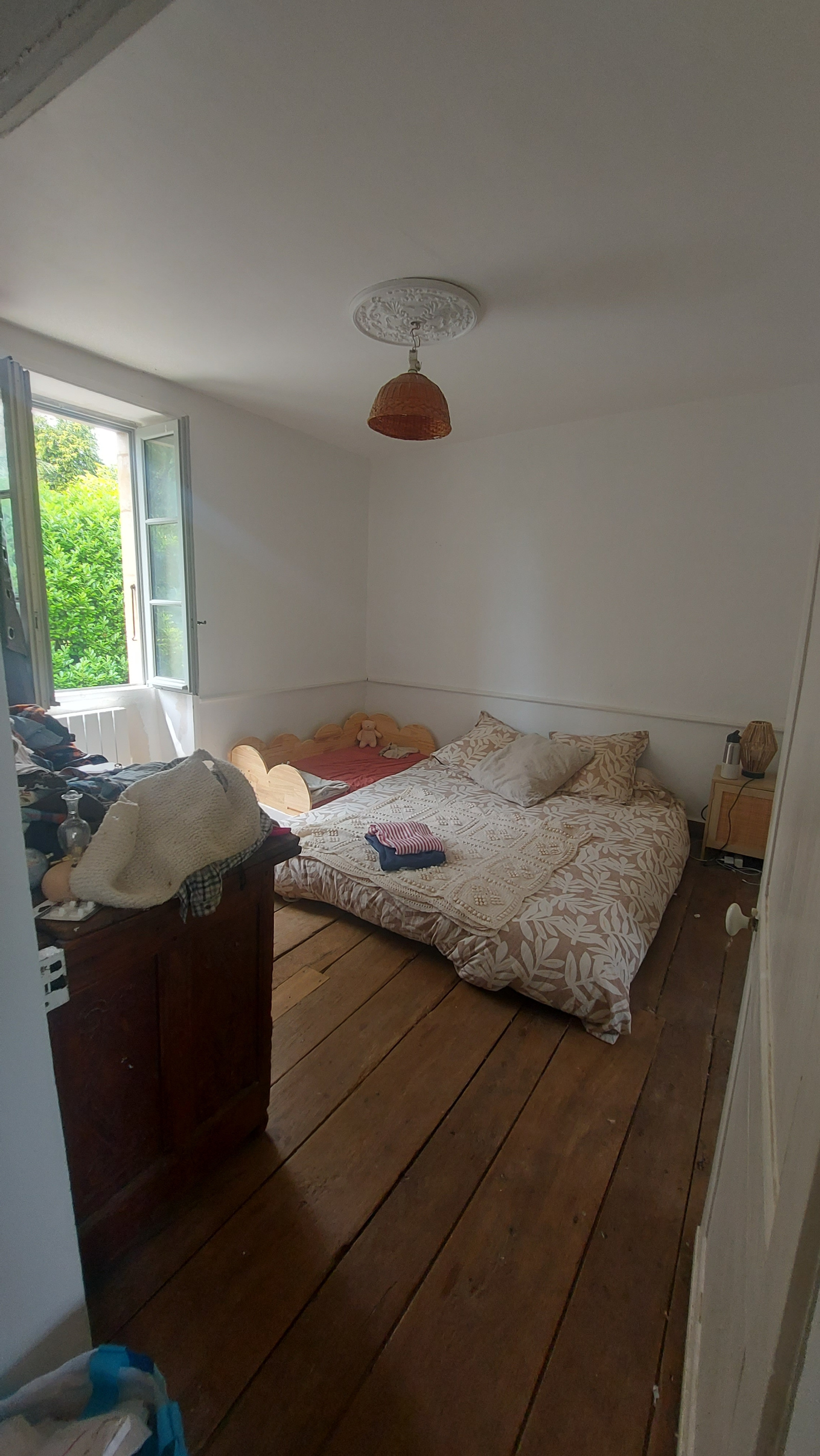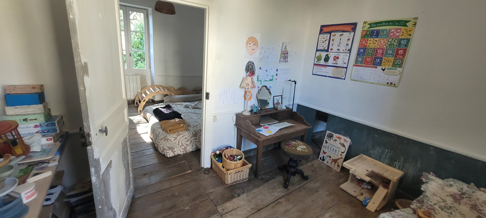 Pierres apparentes, cantou avec poêle. Des éléments authentiques ont été conservé. Œil de bœuf, poutres, vieil évier. Il ne vous reste plus qu'à vous installer pour profiter de cet espace. Quelques marches et vous voici dans le jardin. A l'étage, les parquets ont été conservé. Une première chambre avec placards et cheminée décorative. Une seconde chambre communicante avec un bureau pouvant aisément être réaménagé en dressing ou chambre d'appoint suivant vos envies.