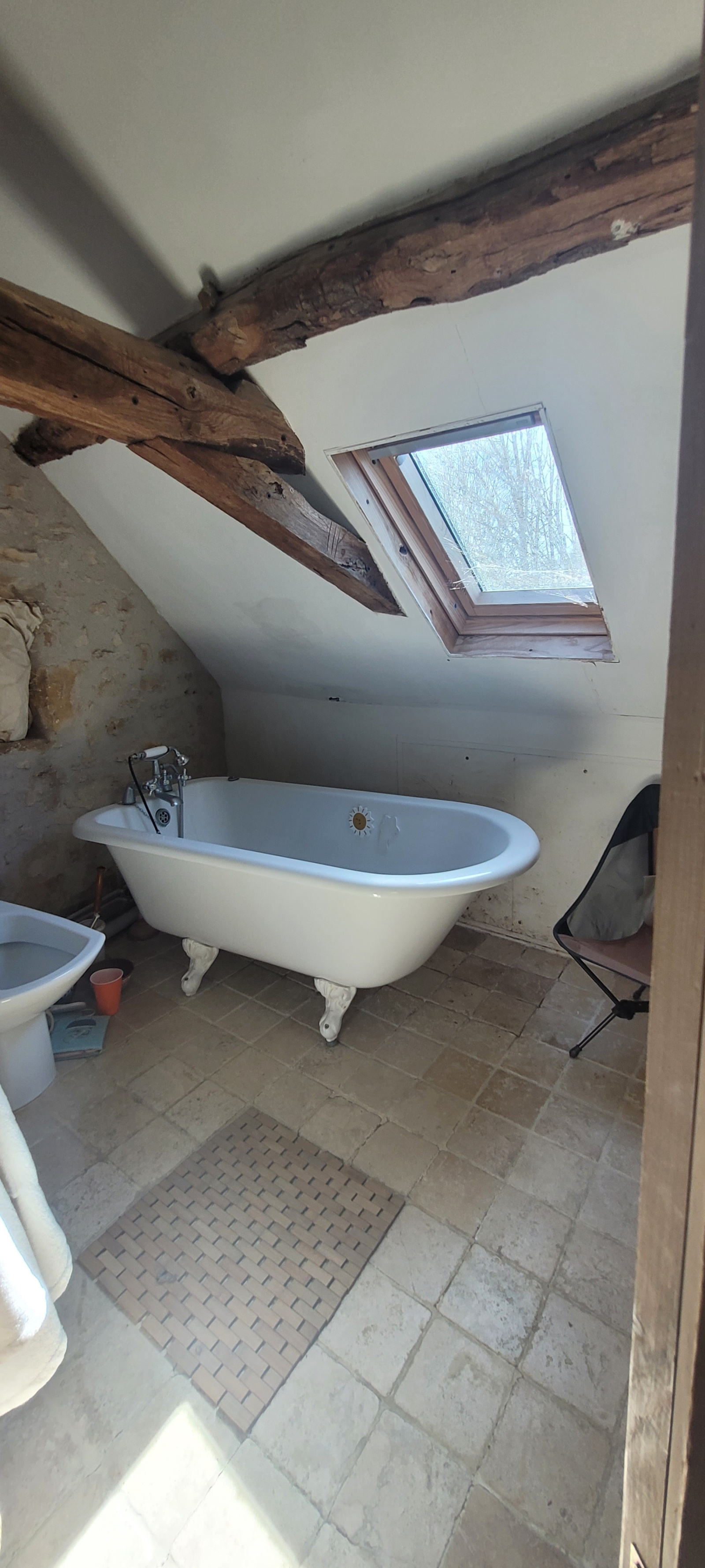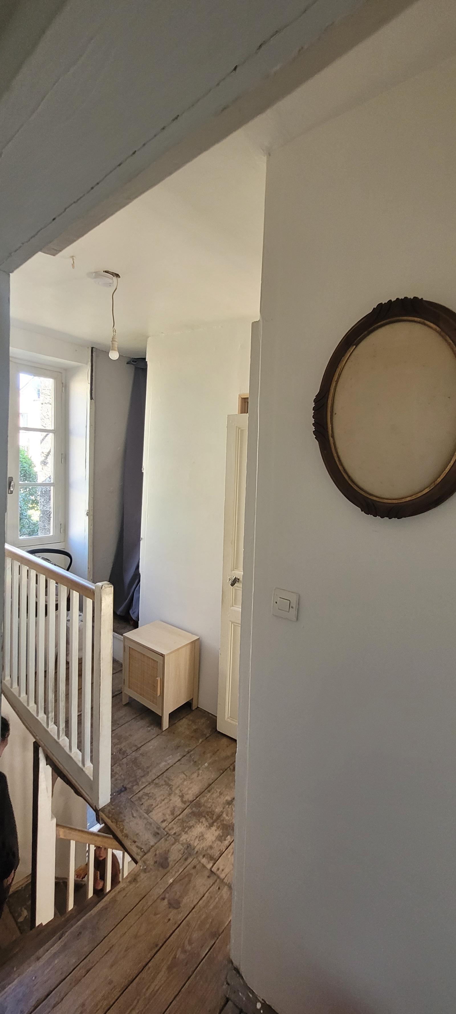 Cet escalier mène à un très bel espace sous comble avec chambre et salle de bains avec WC.