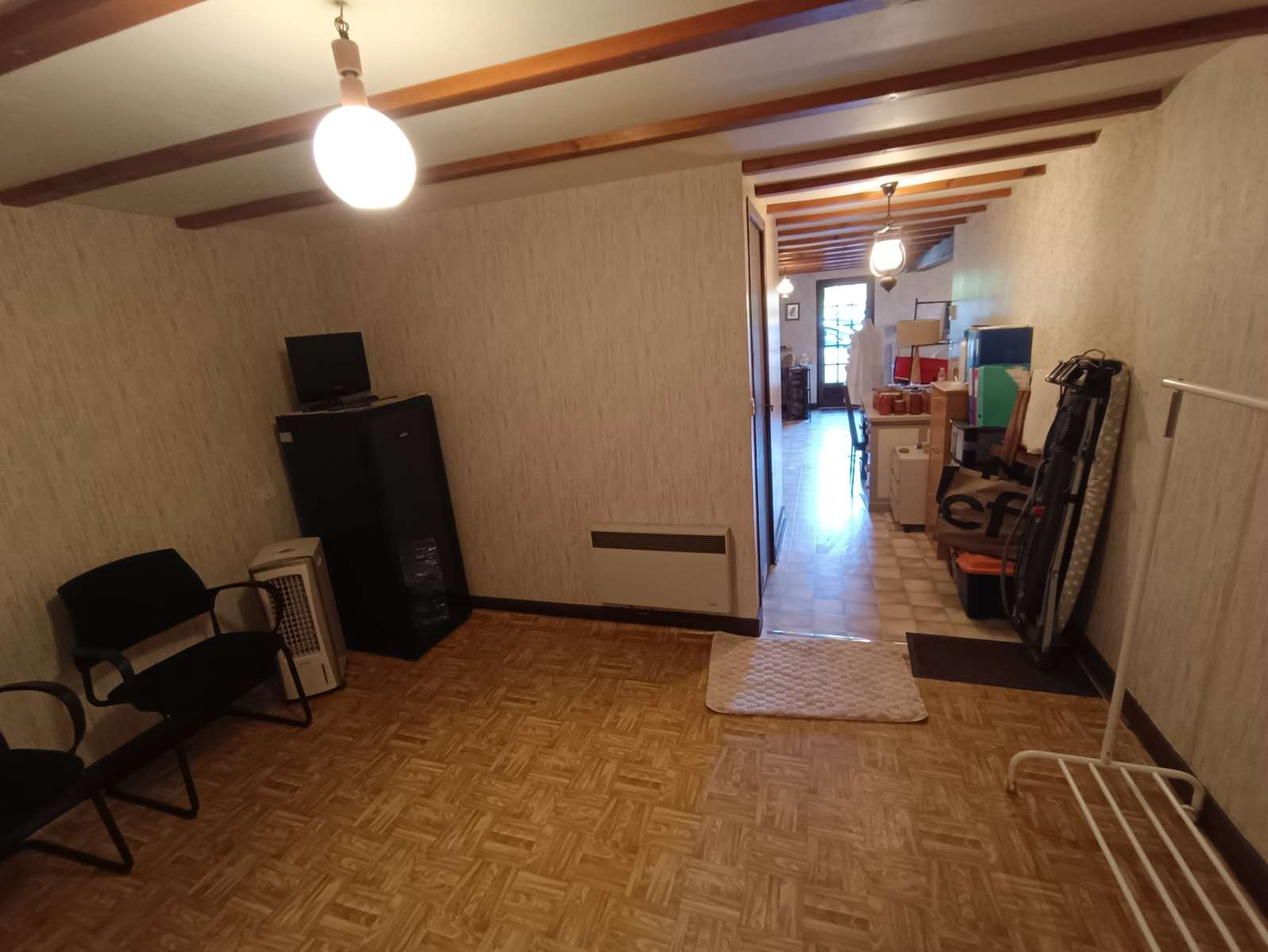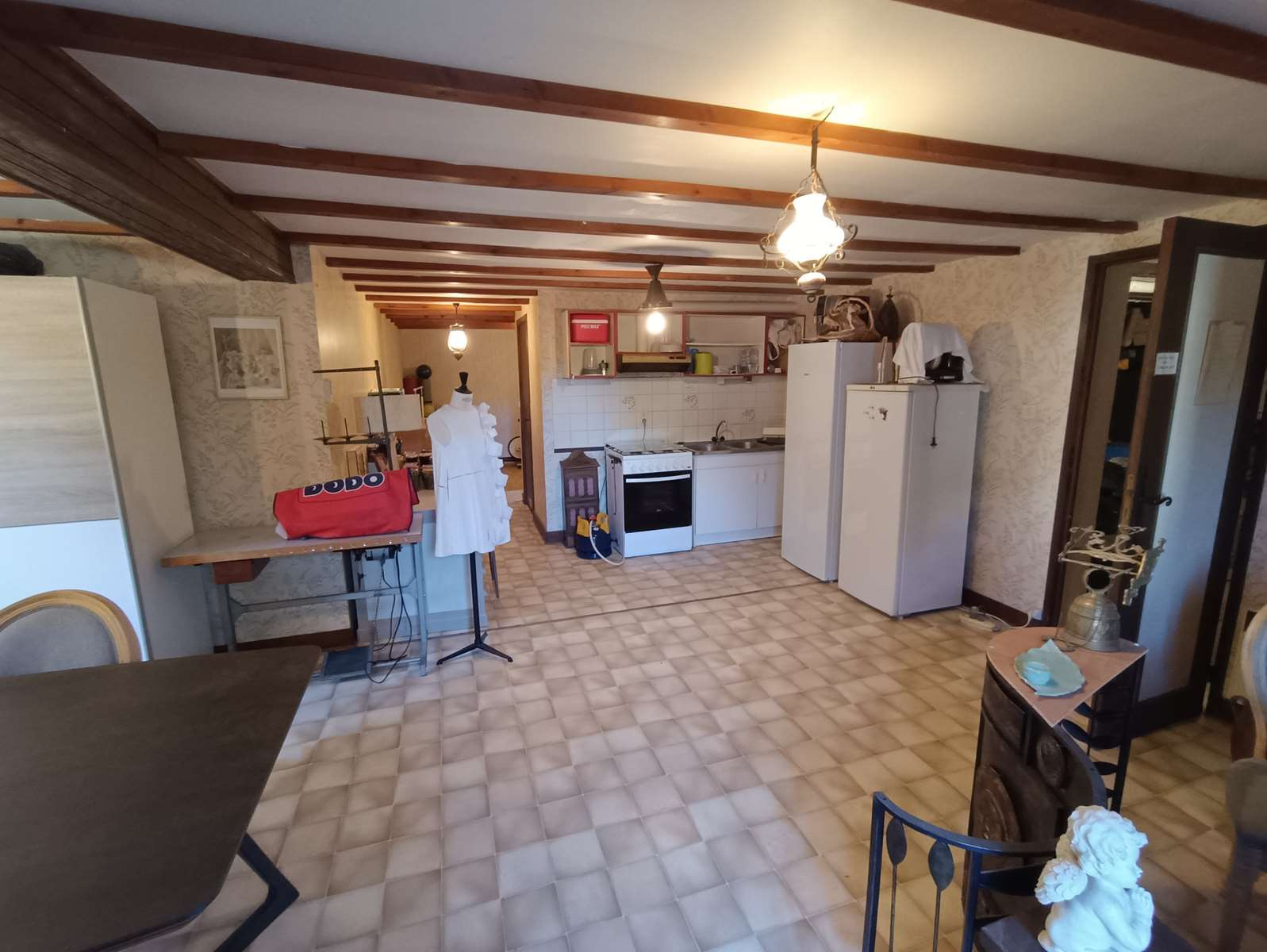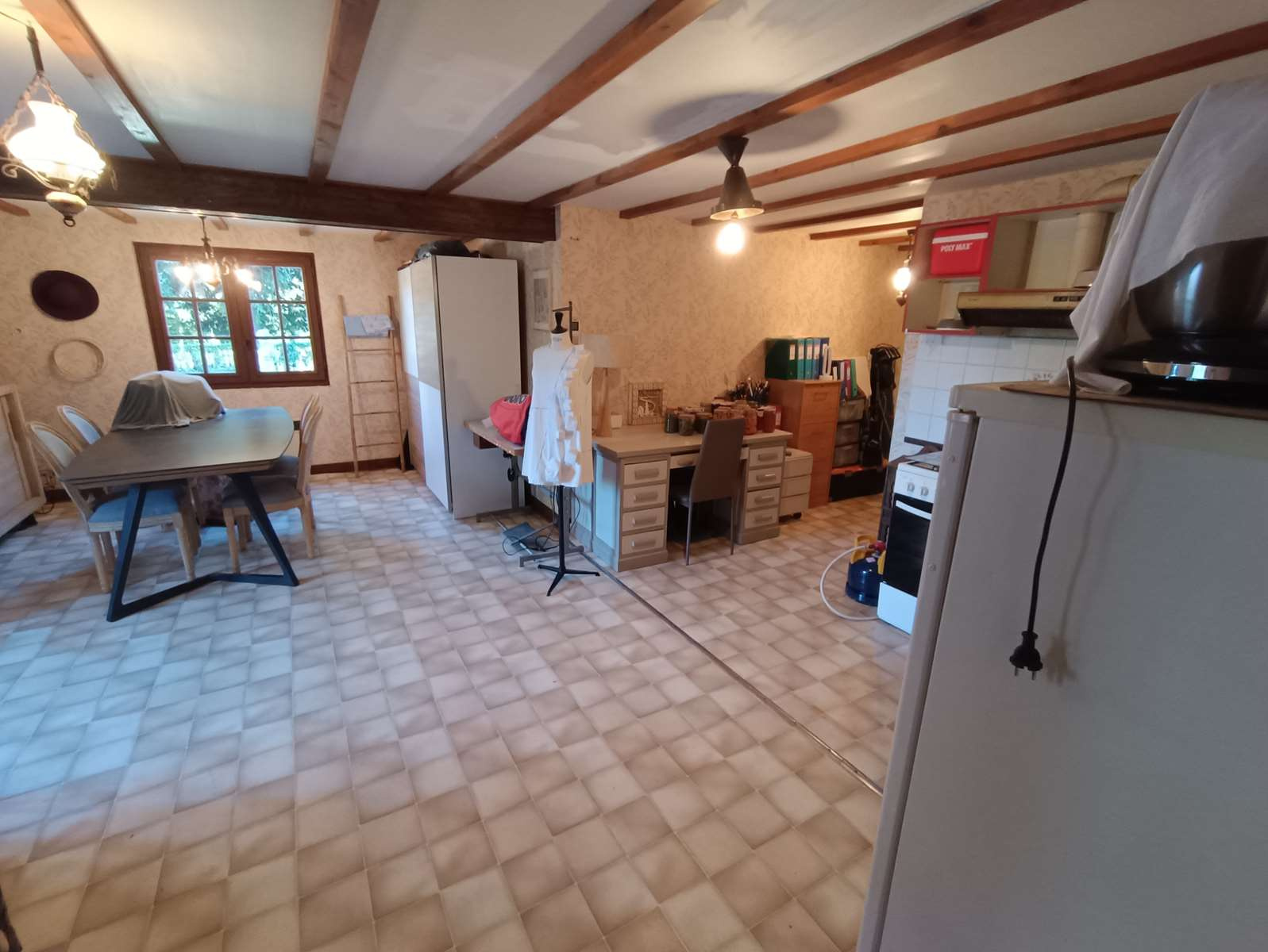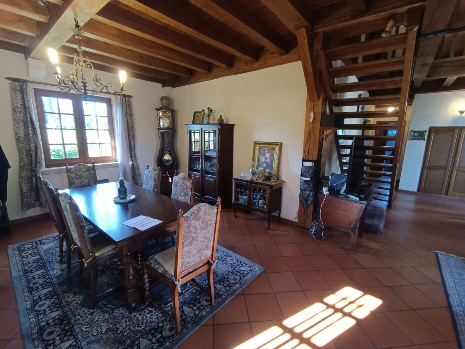 Rez-de-chaussée : vaste pièce de vie avec charpente apparente et cheminée à foyer ouvert, cuisine aménagée et équipée ouvrant sur le sous-sol, trois chambres, salle de bains et WC séparés.