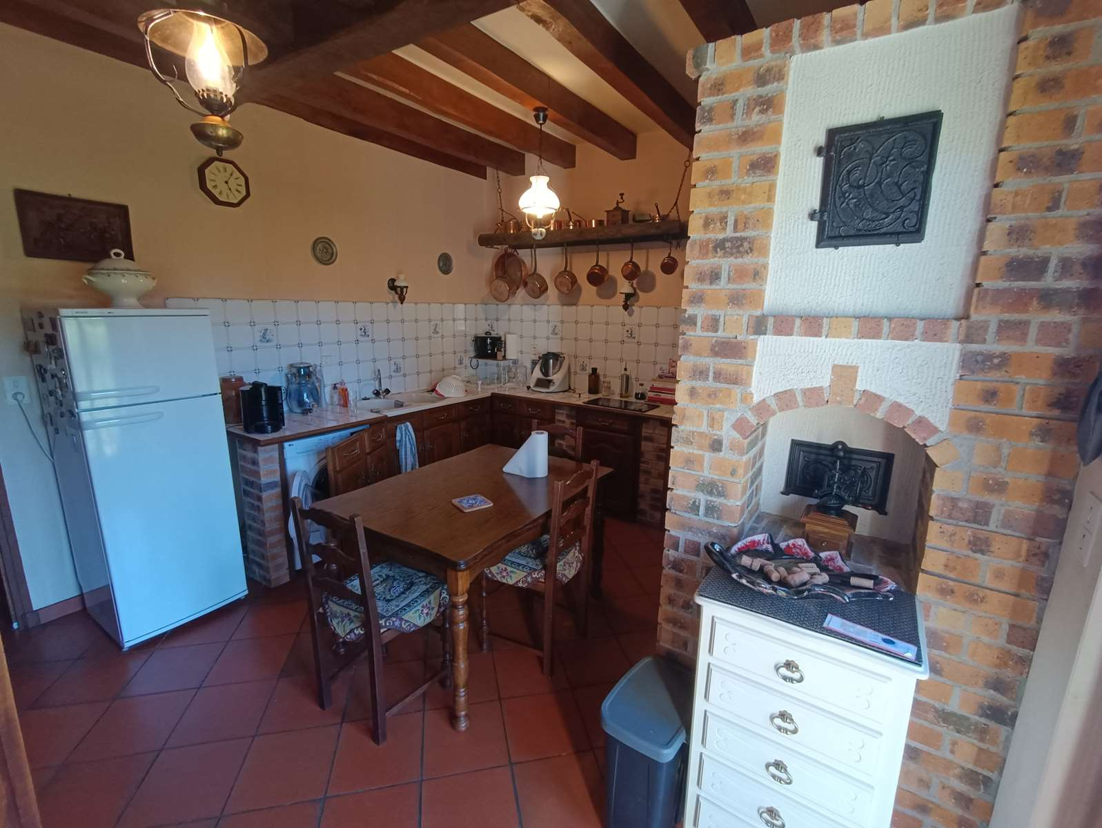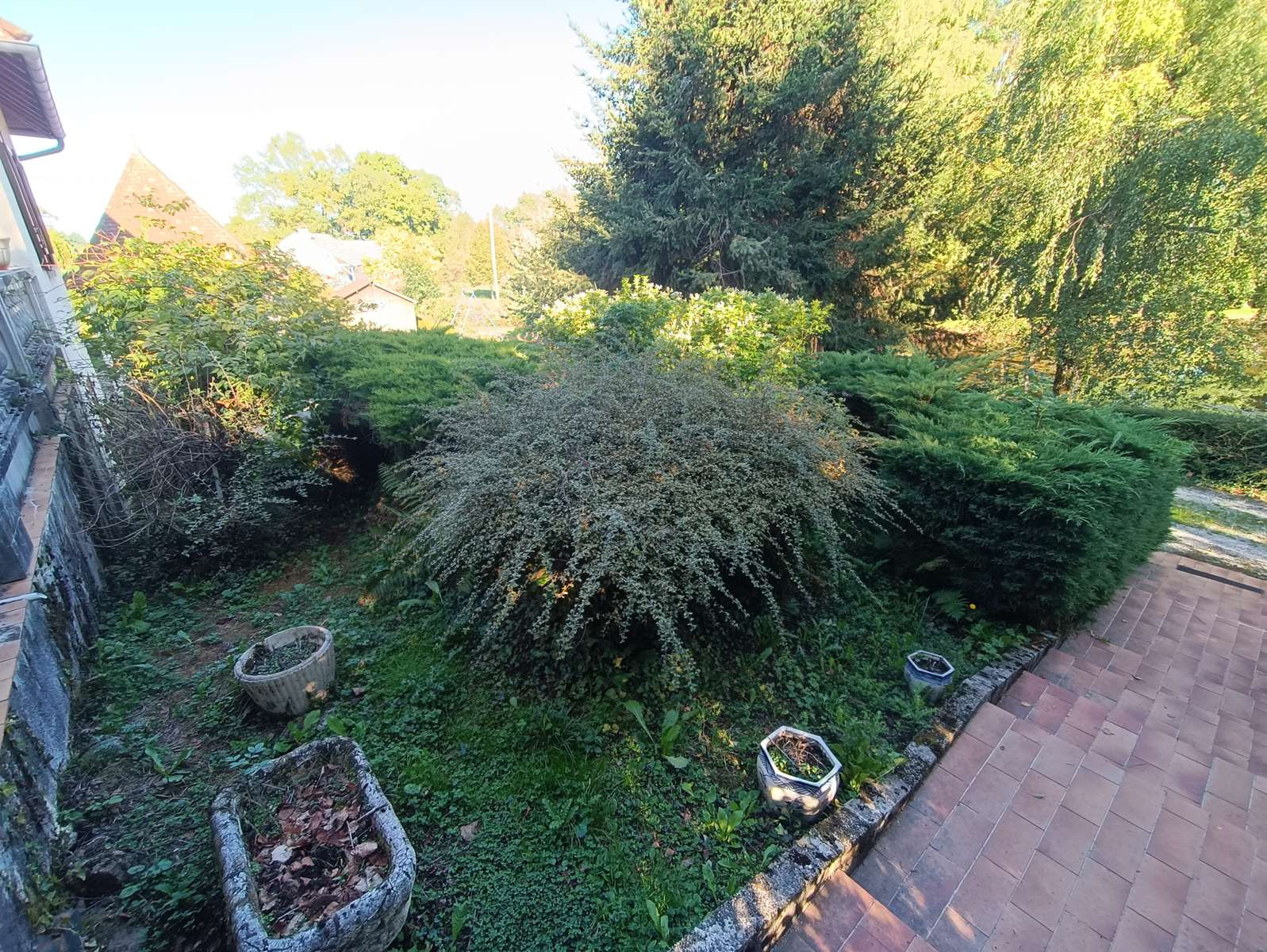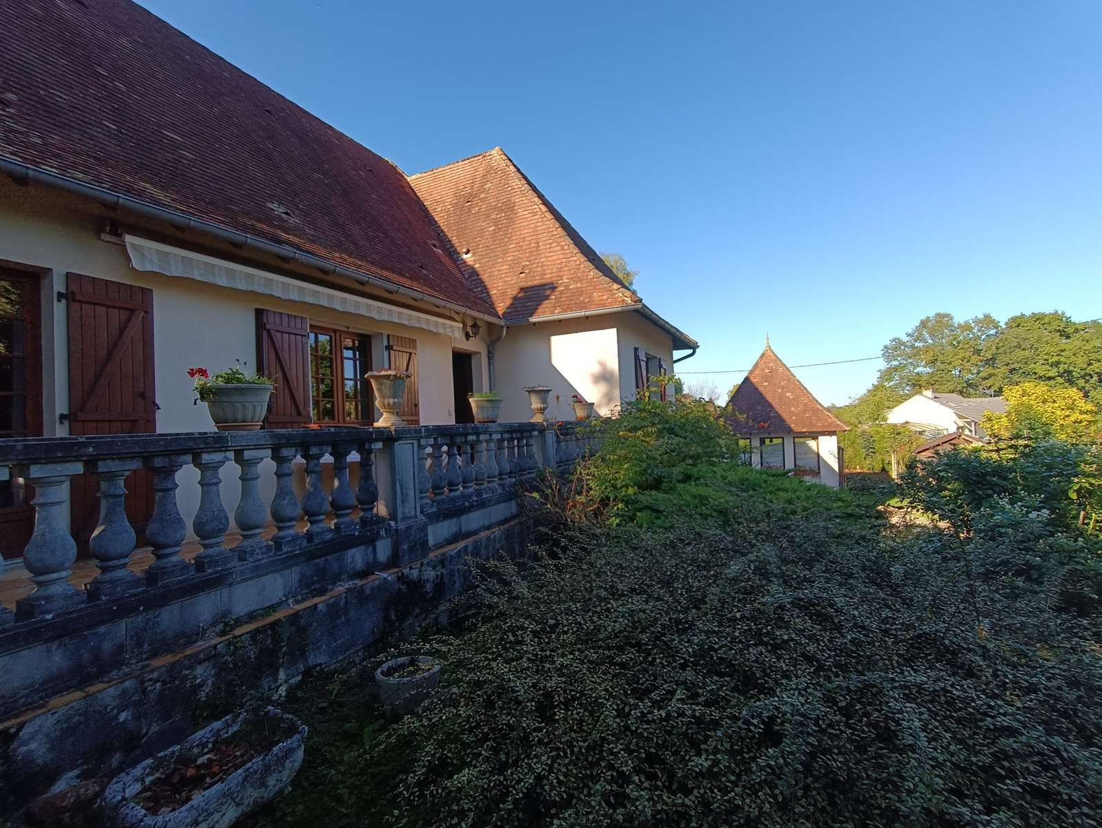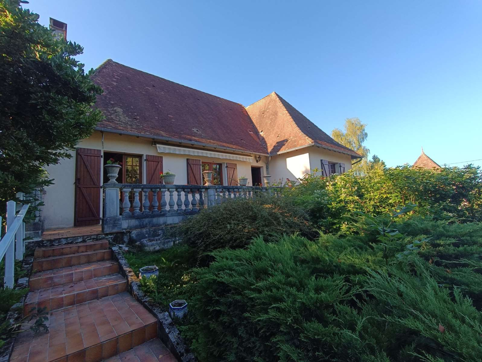 La maison, accessible de plain-pied côté cuisine ou par un escalier fleuri menant à une agréable terrasse, offre de beaux volumes et une atmosphère chaleureuse.