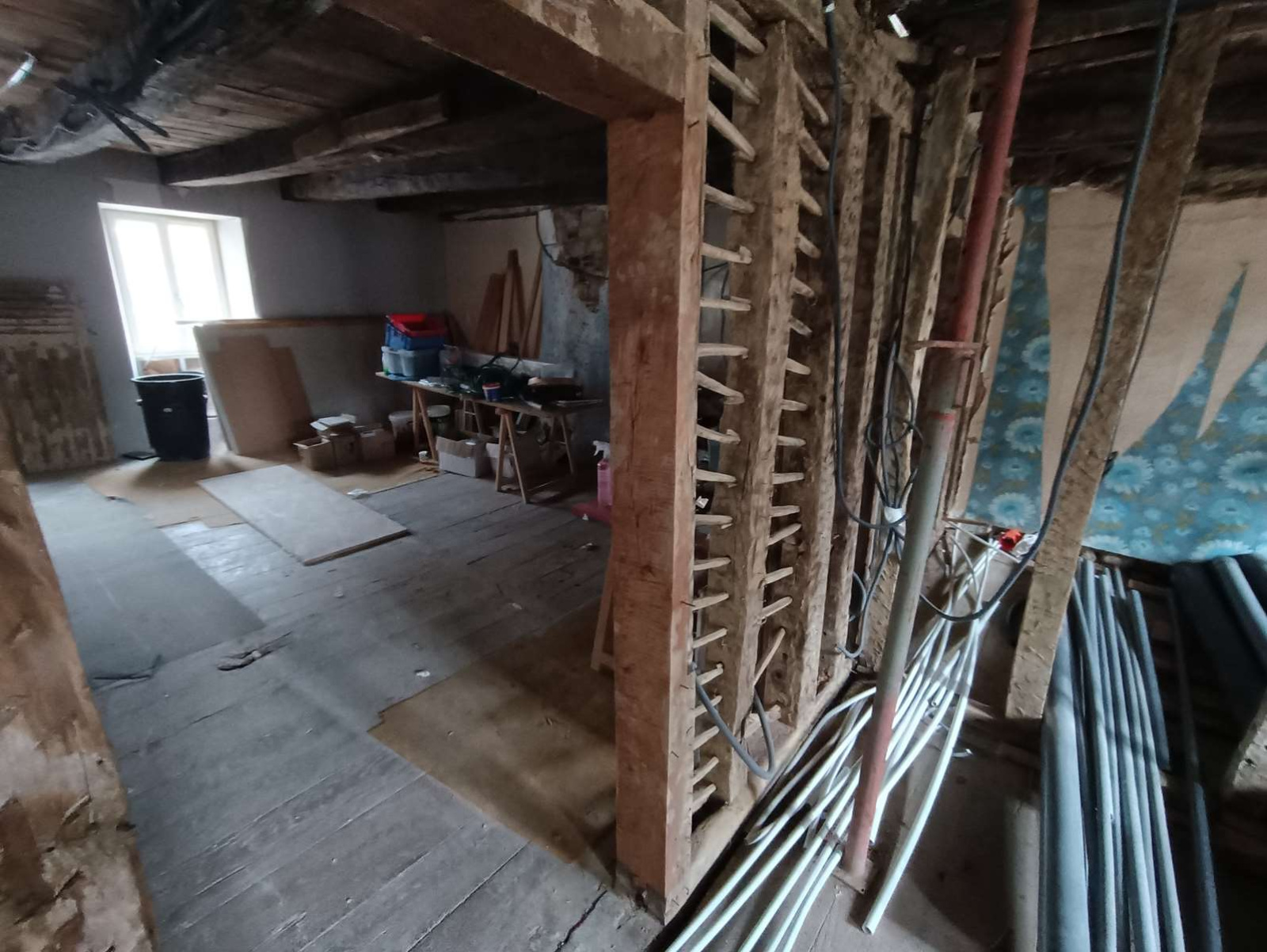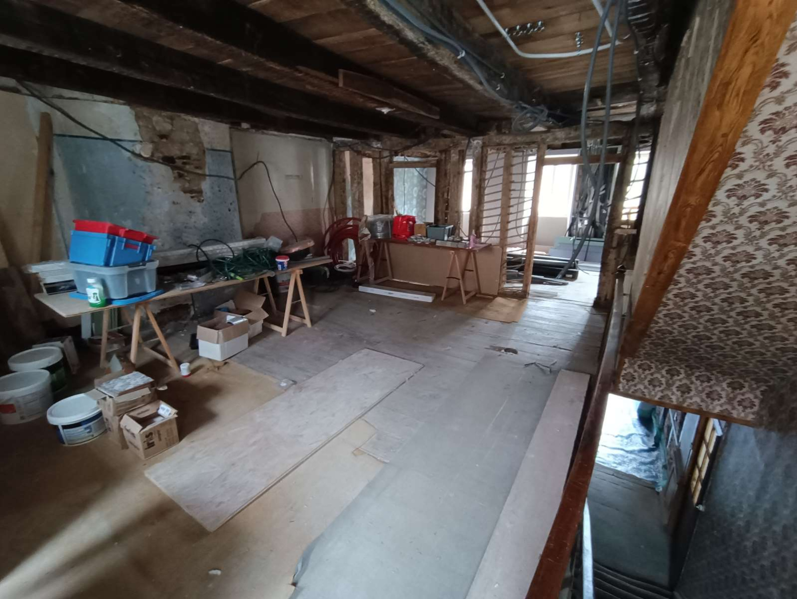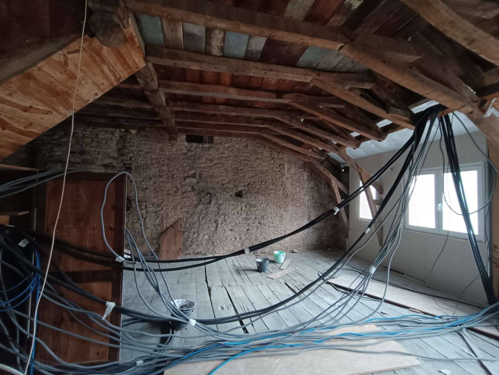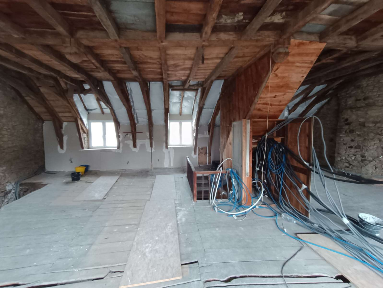 Plateaux équipés de câbles d'alimentation, d’un tableau électrique générale, partiellement isolés avec double vitrage, à finir de rénover.