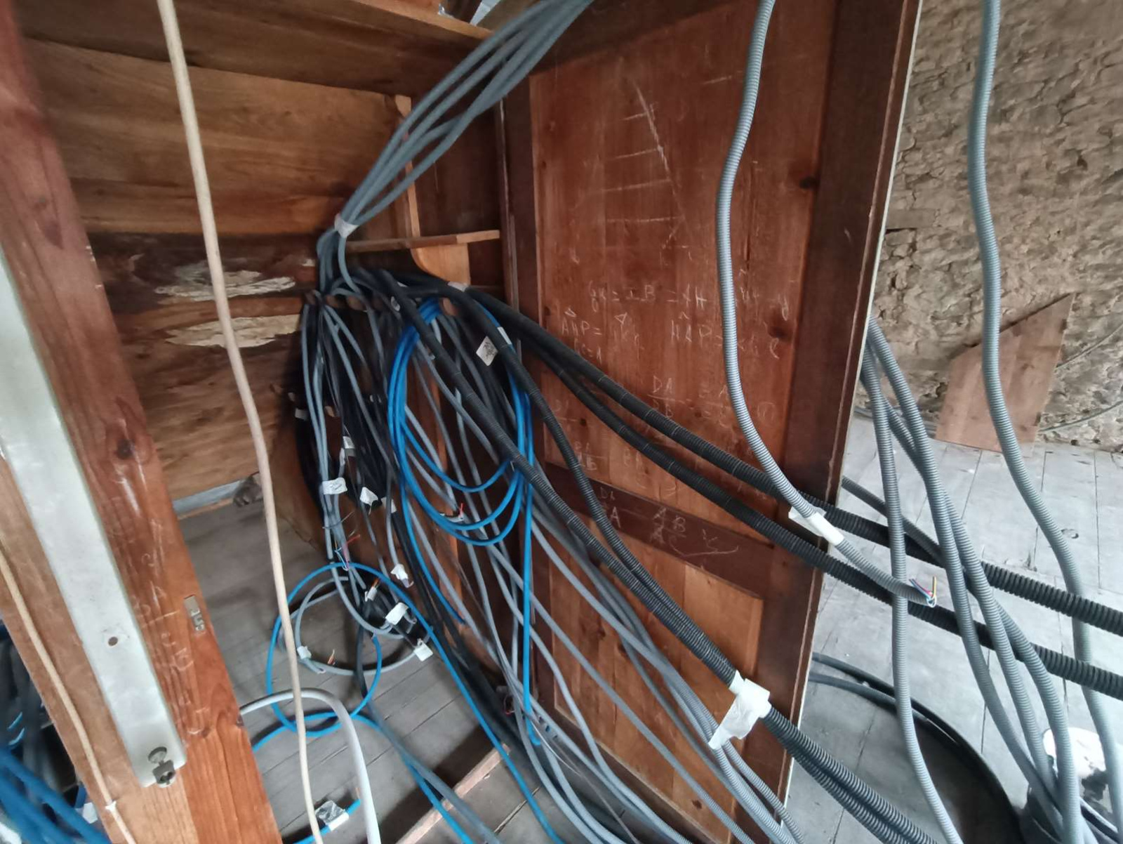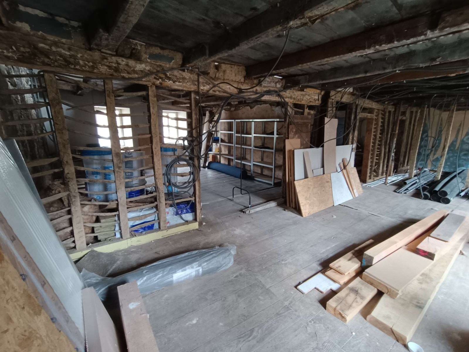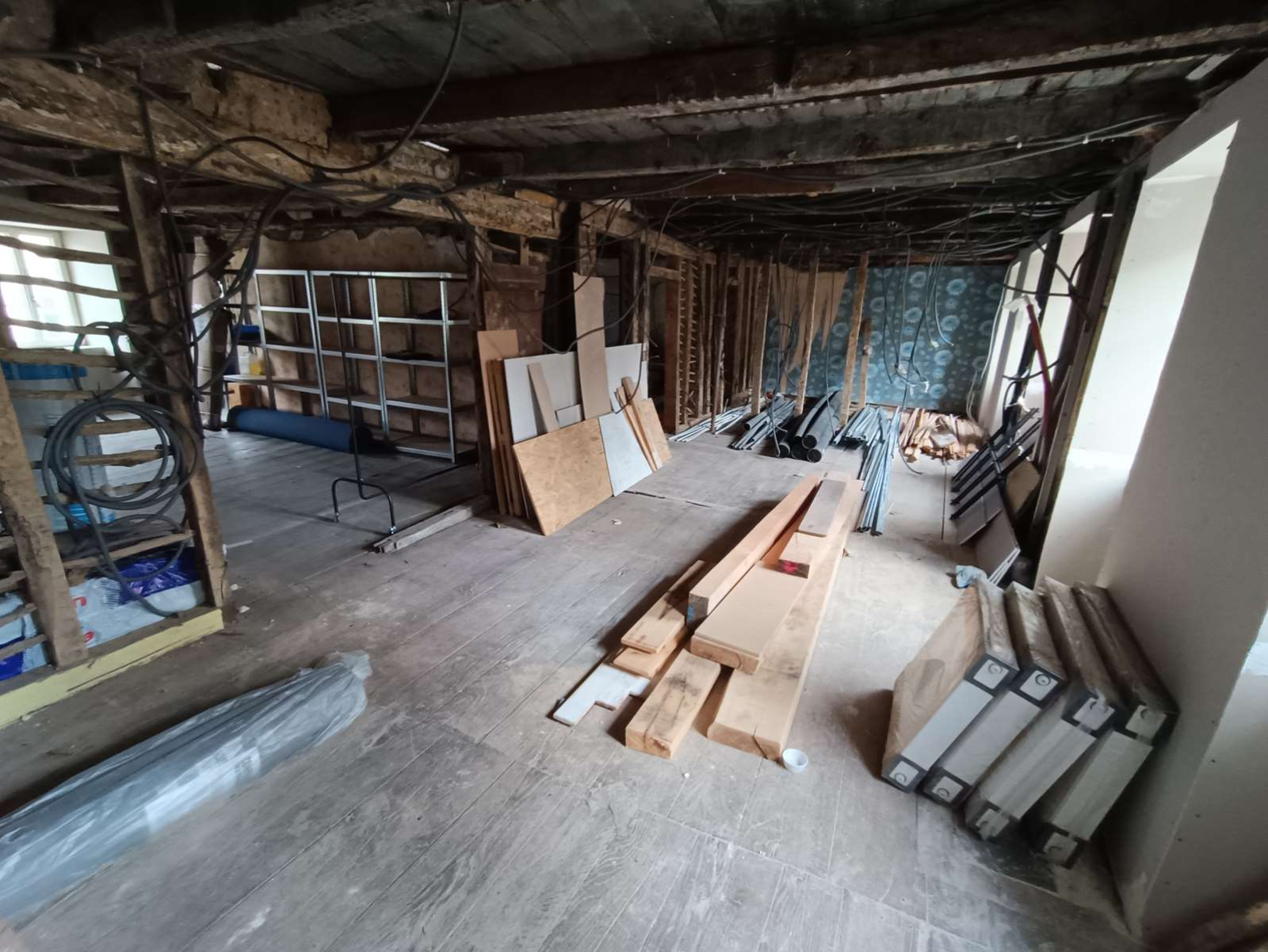 Plateaux équipés de câbles d'alimentation, d’un tableau électrique générale, partiellement isolés avec double vitrage, à finir de rénover.