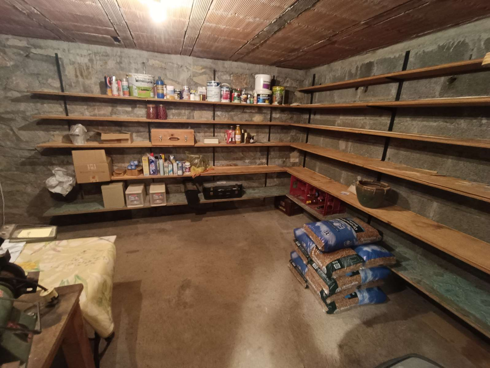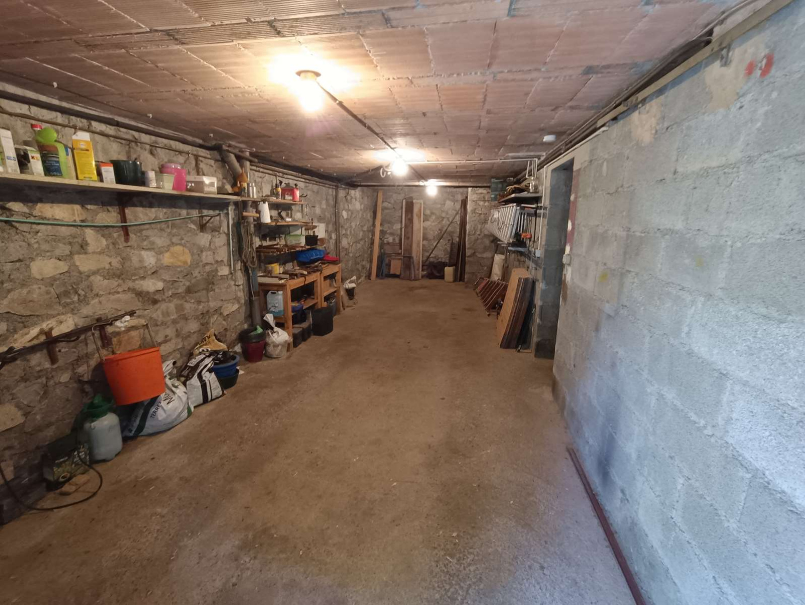 L’étage principal, accessible de plain-pied, comprend une entrée équipée d’un poêle à granulés pour un confort optimal, une véranda lumineuse, une pièce à vivre chaleureuse avec cheminée ouverte, une cuisine aménagée et semi-équipée, trois chambres, une salle d’eau, un WC indépendant et un second cellier pratique.