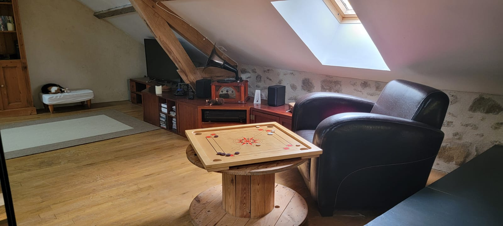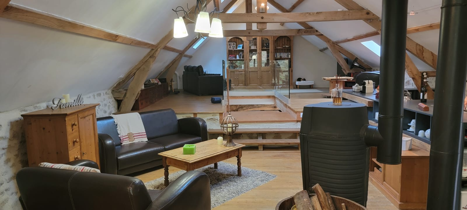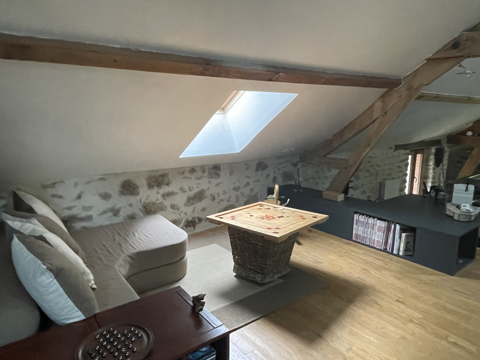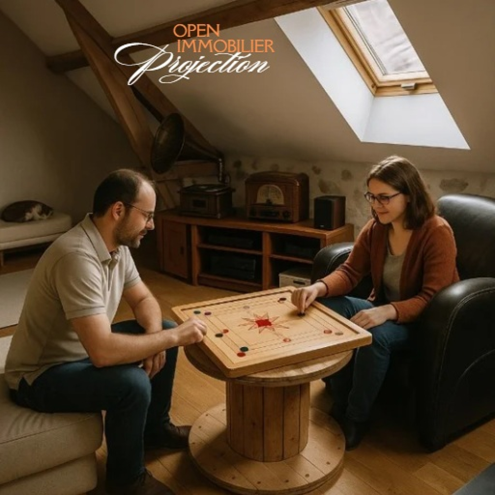 L’espace de vie en open-space dévoile tout son caractère : hauteur sous plafond, ambiance mansardée, et lumière naturelle grâce aux puits de lumière parfaitement intégrés. La cuisine ouverte, la salle à manger conviviale, le salon chaleureux et le coin jeu composent un ensemble idéal pour les moments en famille.