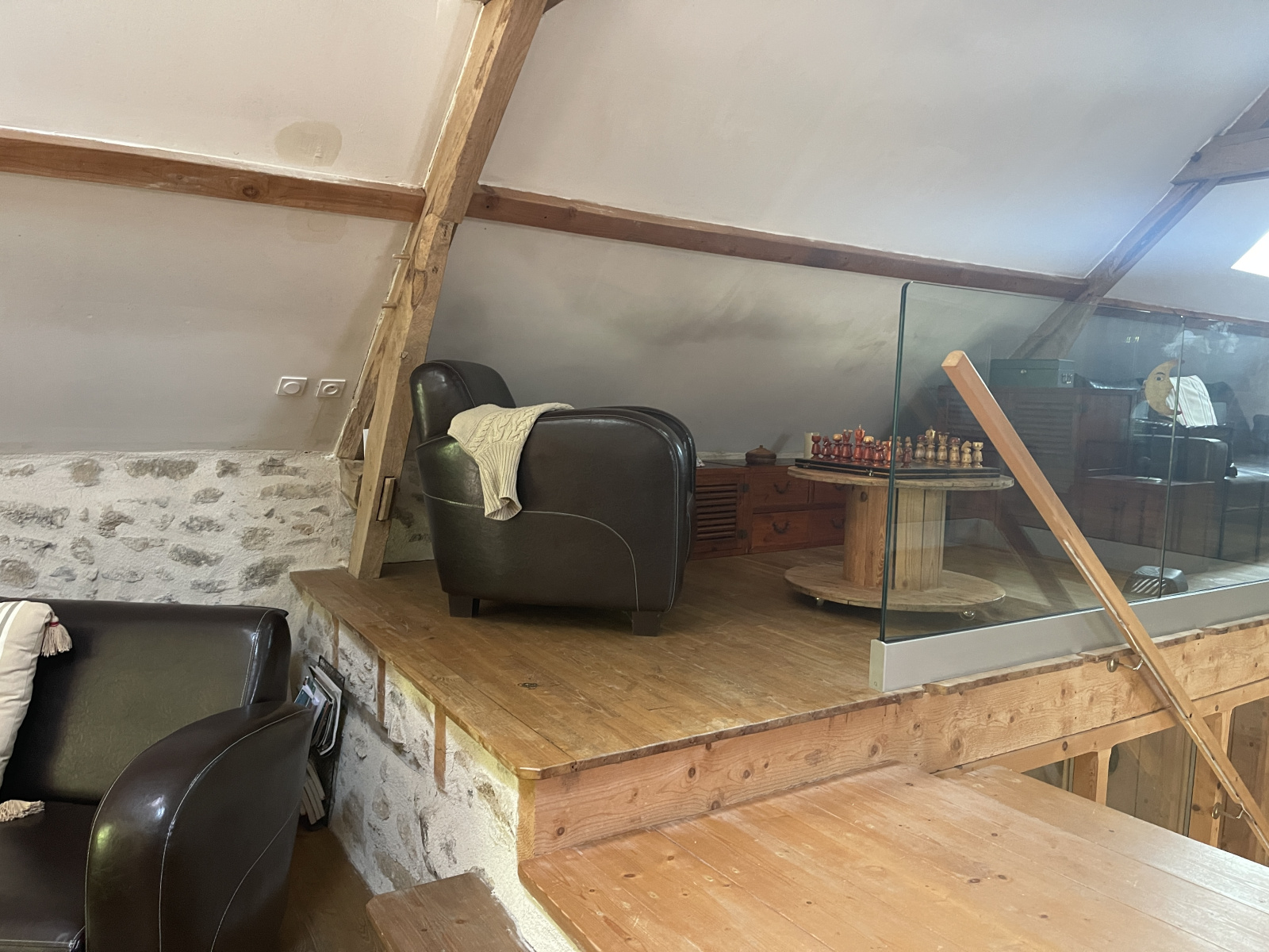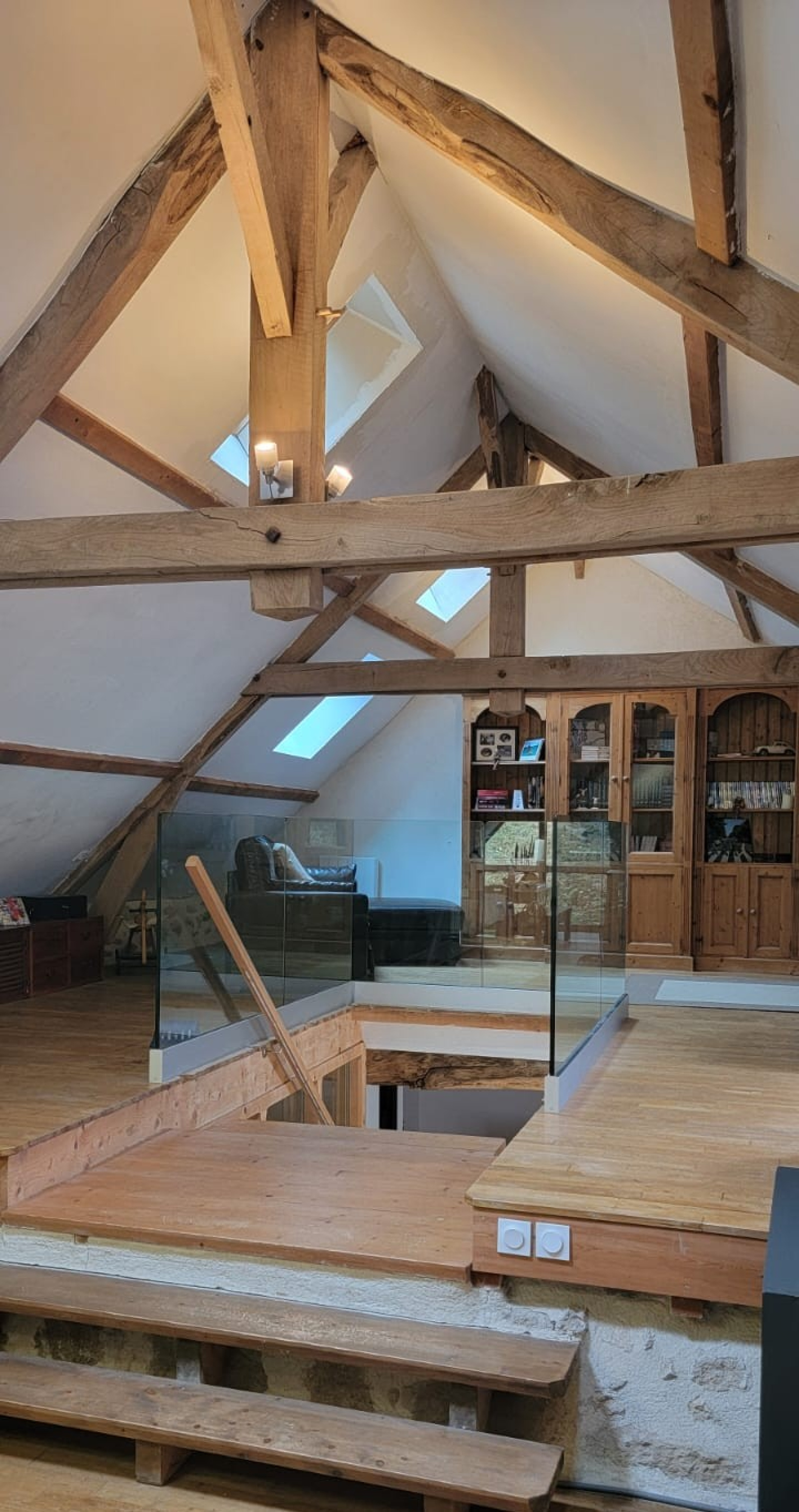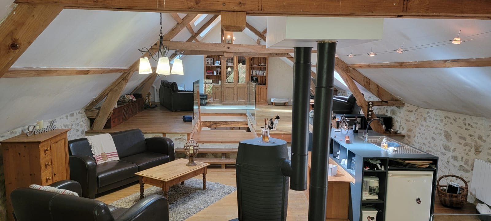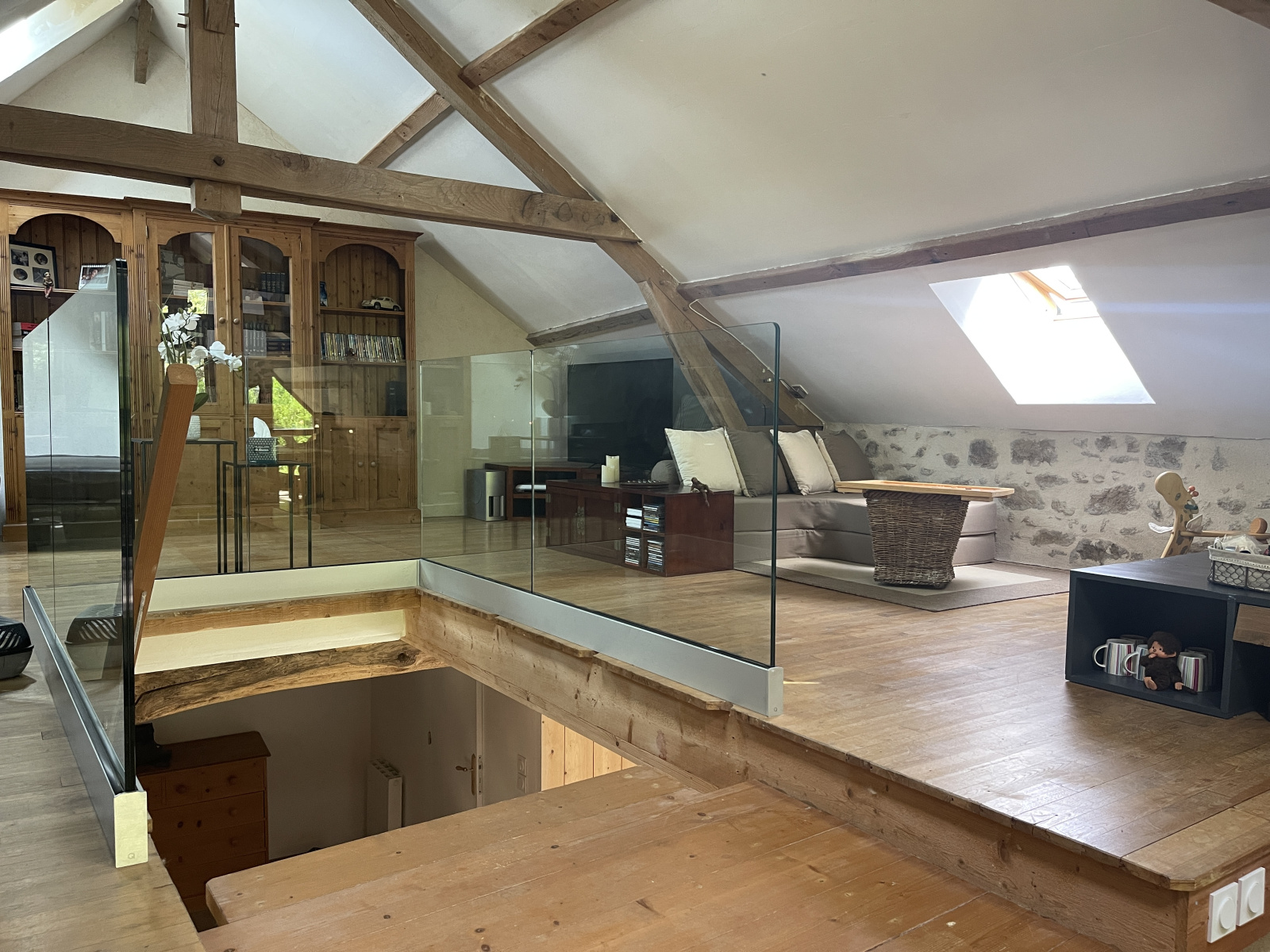 L’espace de vie en open-space dévoile tout son caractère : hauteur sous plafond, ambiance mansardée, et lumière naturelle grâce aux puits de lumière parfaitement intégrés. La cuisine ouverte, la salle à manger conviviale, le salon chaleureux et le coin jeu composent un ensemble idéal pour les moments en famille.