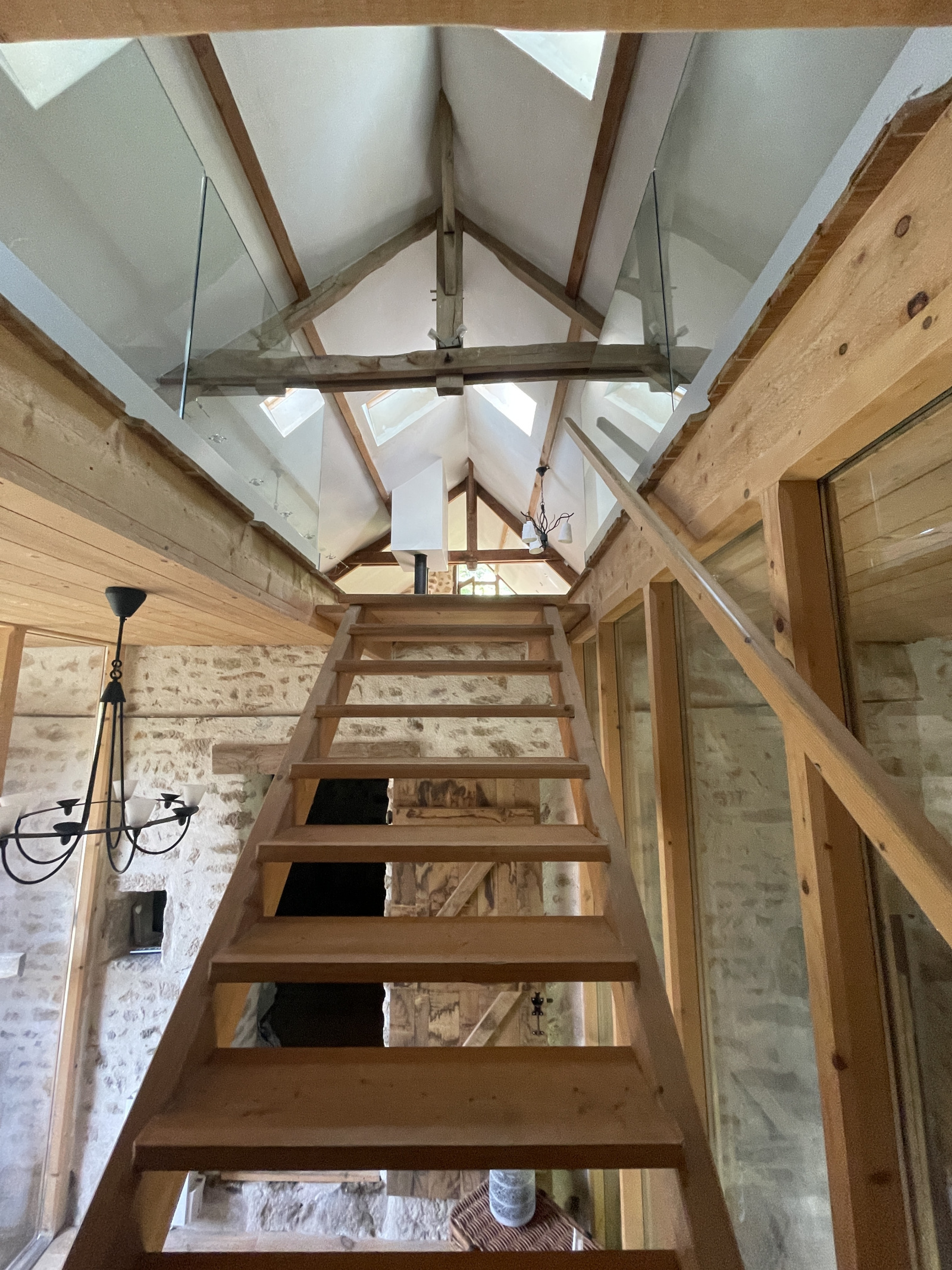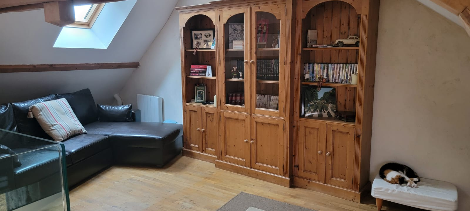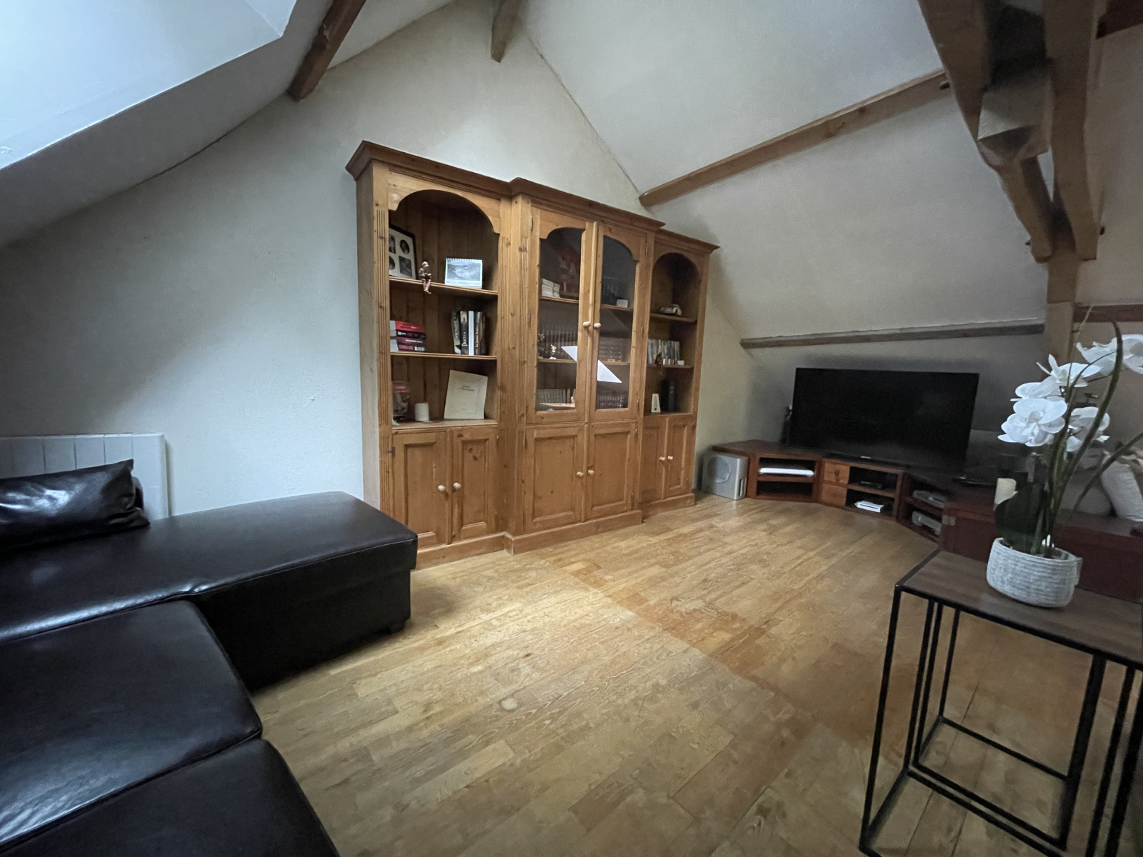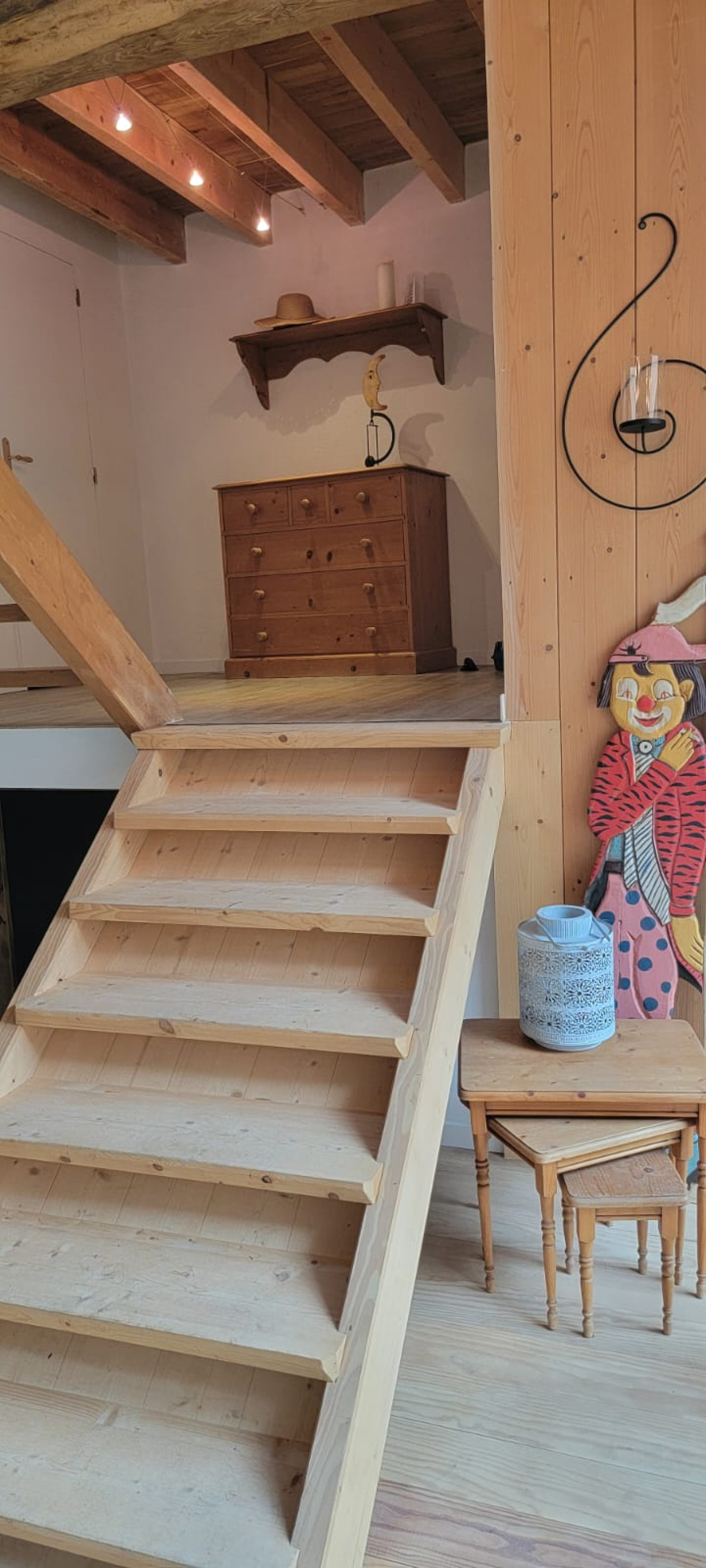 L’espace de vie en open-space dévoile tout son caractère : hauteur sous plafond, ambiance mansardée, et lumière naturelle grâce aux puits de lumière parfaitement intégrés. La cuisine ouverte, la salle à manger conviviale, le salon chaleureux et le coin jeu composent un ensemble idéal pour les moments en famille.