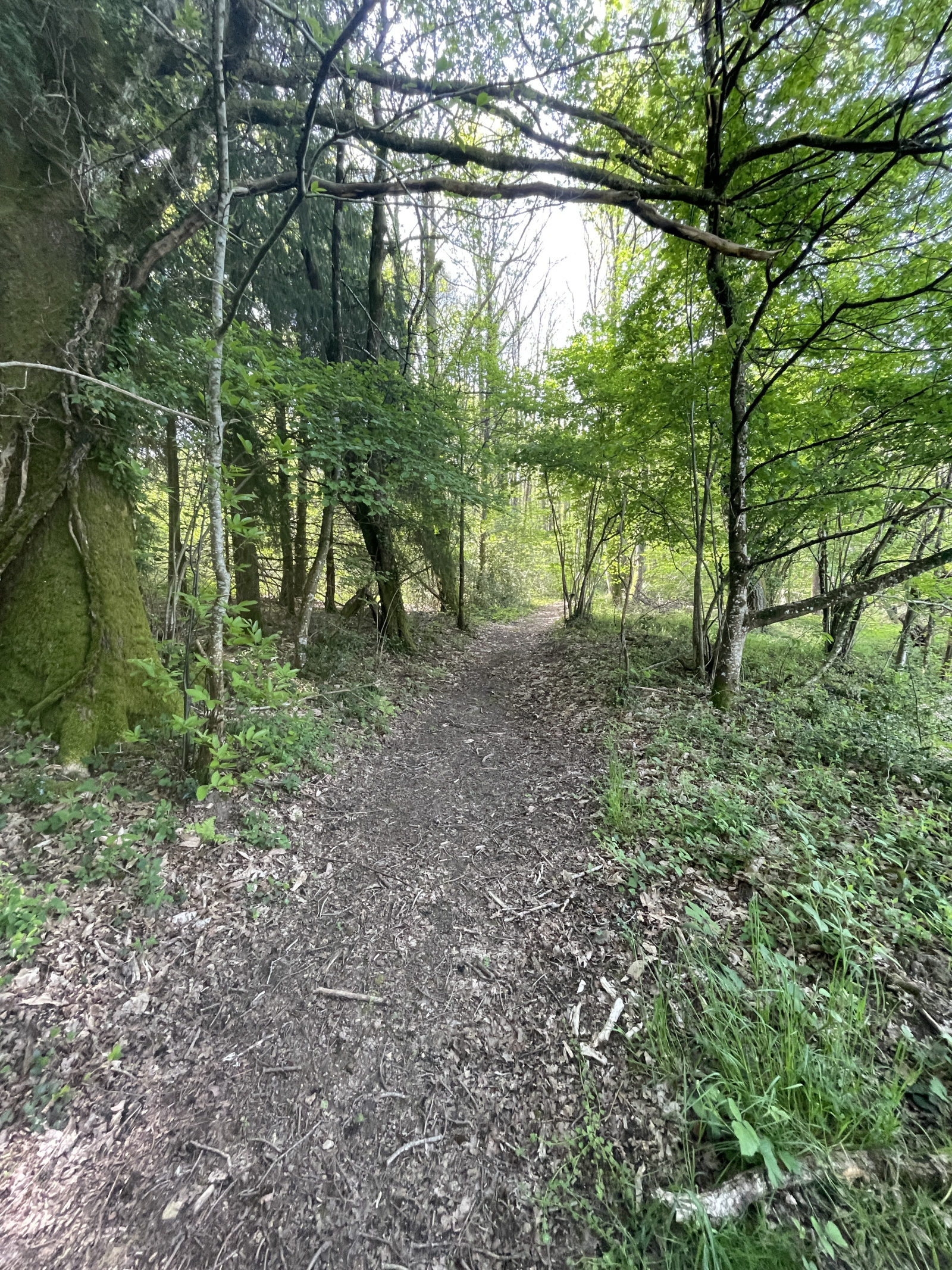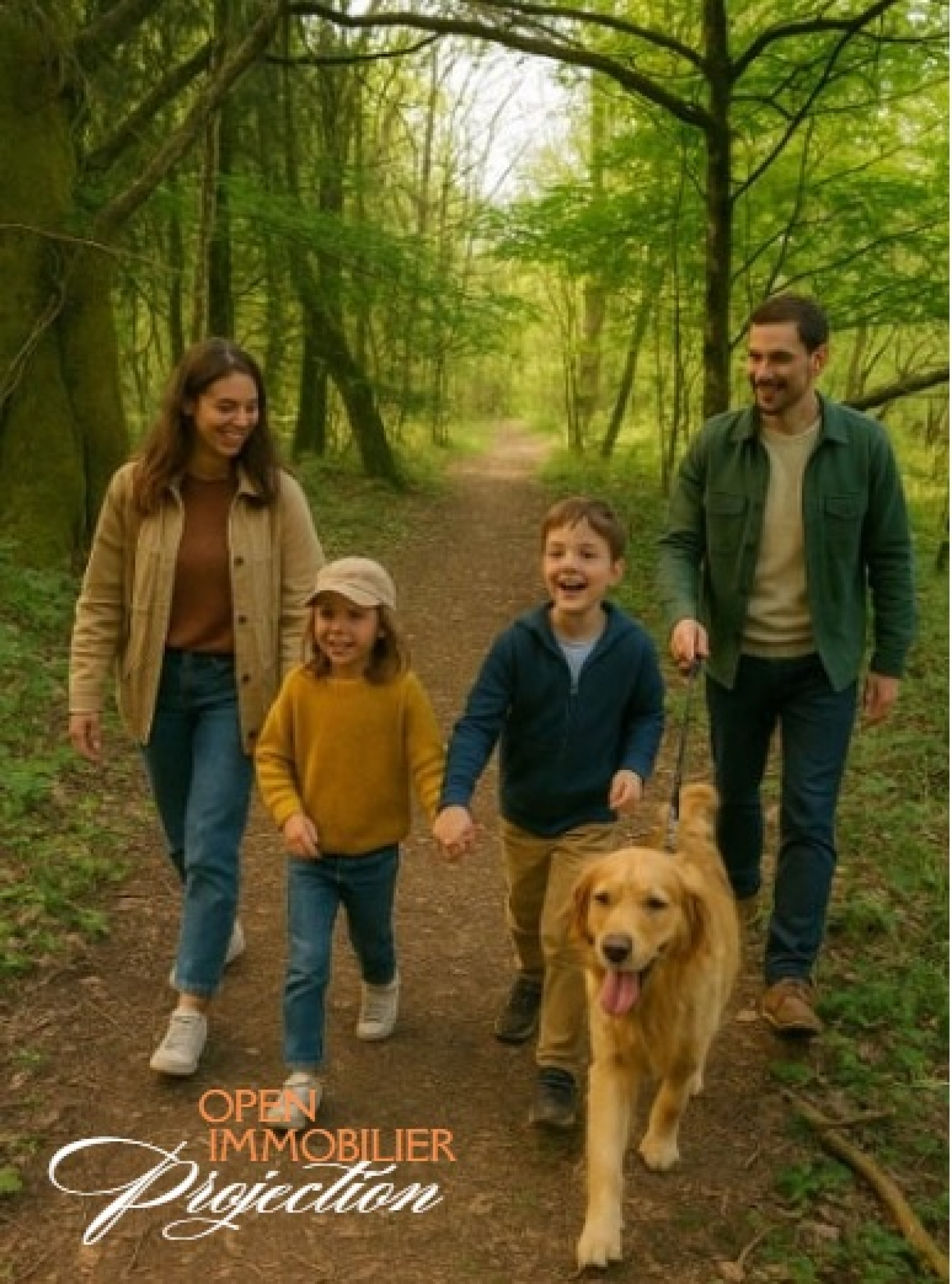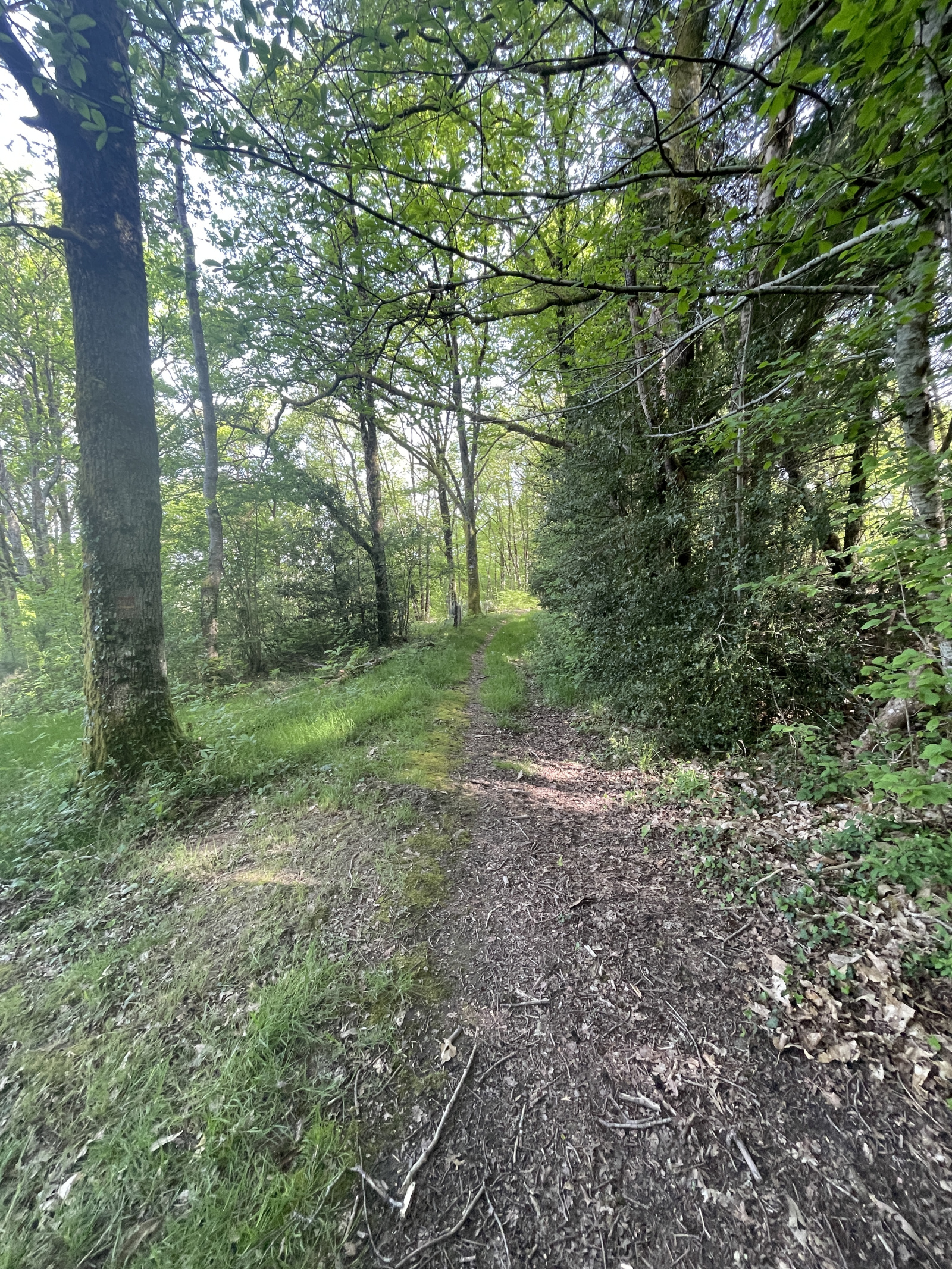 Le terrain arboré entoure la maison et donne un accès direct à de superbes sentiers de promenade en sous-bois.
