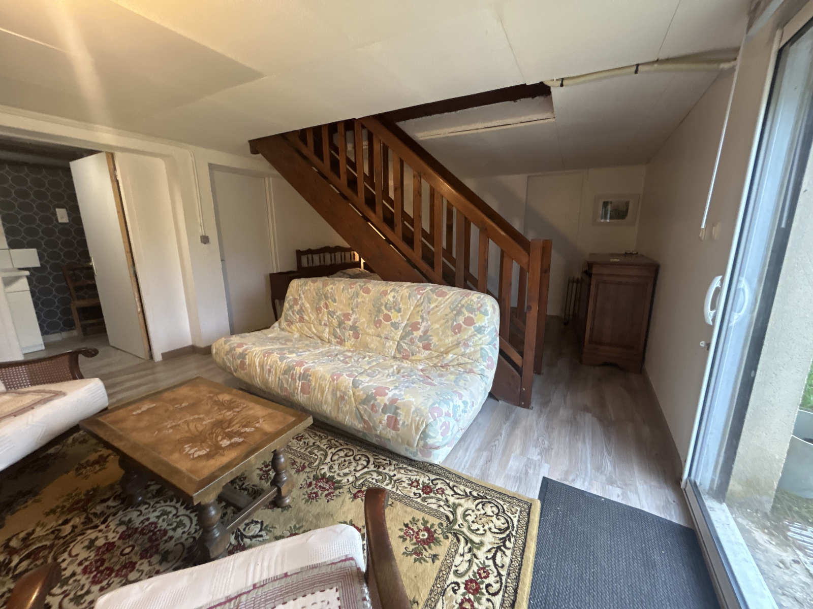 En dessous, en rez de jardin, un salon, une chambre, une salle d'eau avec wc, une buanderie et stockage. L'accès peut-être indépendant par la baie vitrée.