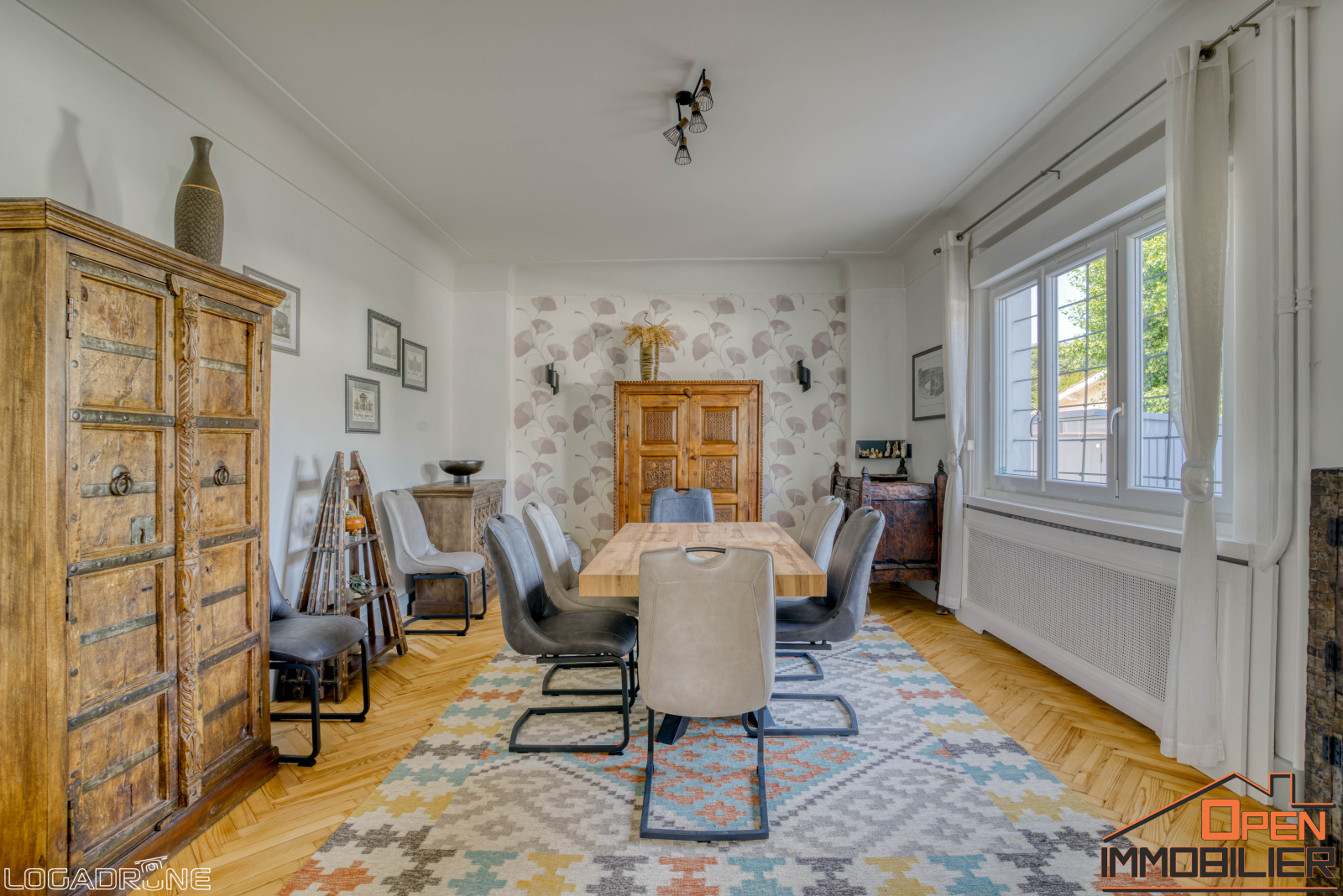 - Salon / salle à manger de 48 m² : parquet en bâton rompu d’origine, grandes baies vitrées, lumière traversante