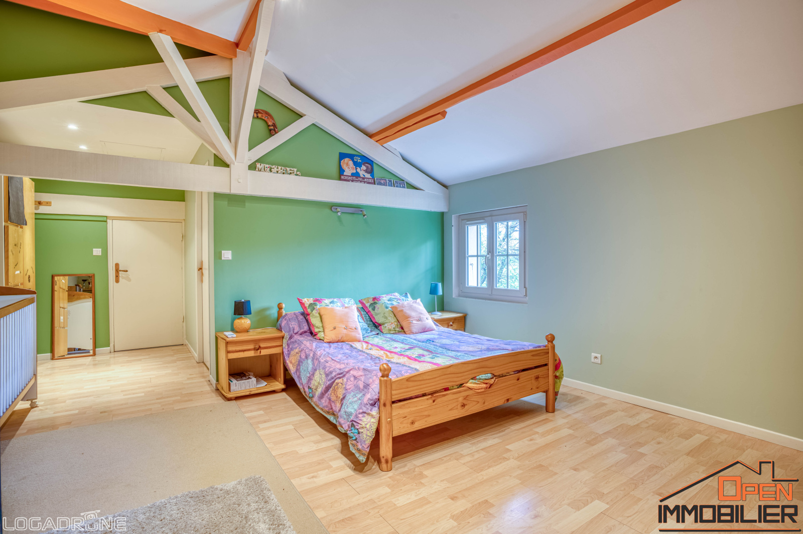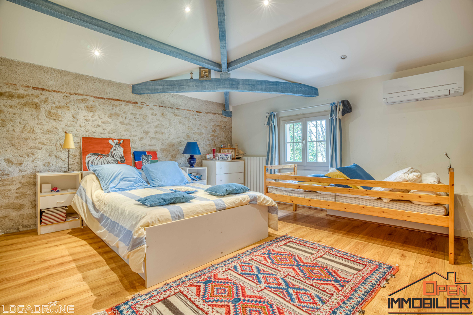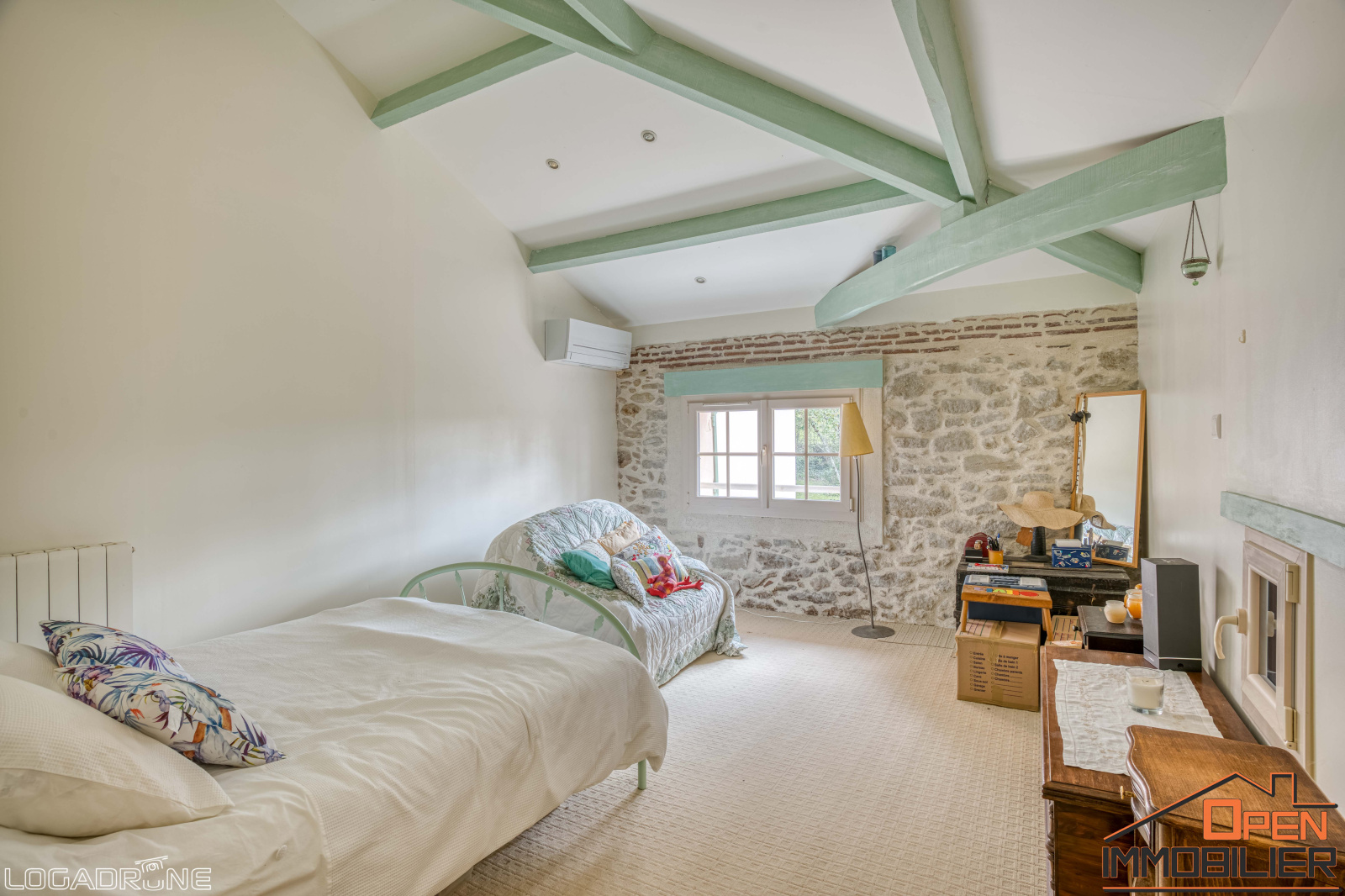 À l’étage, un palier dessert un espace détente, trois chambres mansardées, un bureau, deux salles d’eau avec WC, une chaufferie ainsi qu’un grenier aménageable, offrant encore de belles possibilités d’aménagement. Pour un confort optimal, la maison dispose de la climatisation réversible dans les chambres principales, du double vitrage, d’un chauffage central au fioul avec radiateurs en fonte et d’une fosse septique entretenue.