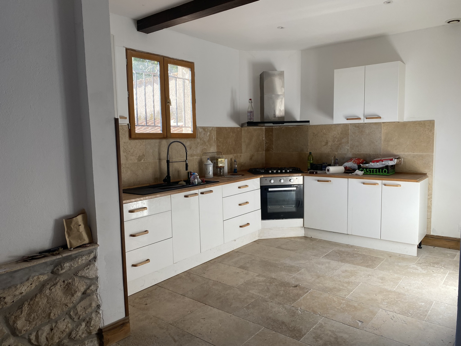 Séjour lumineux avec cheminée ouvert sur une cuisine conviviale
