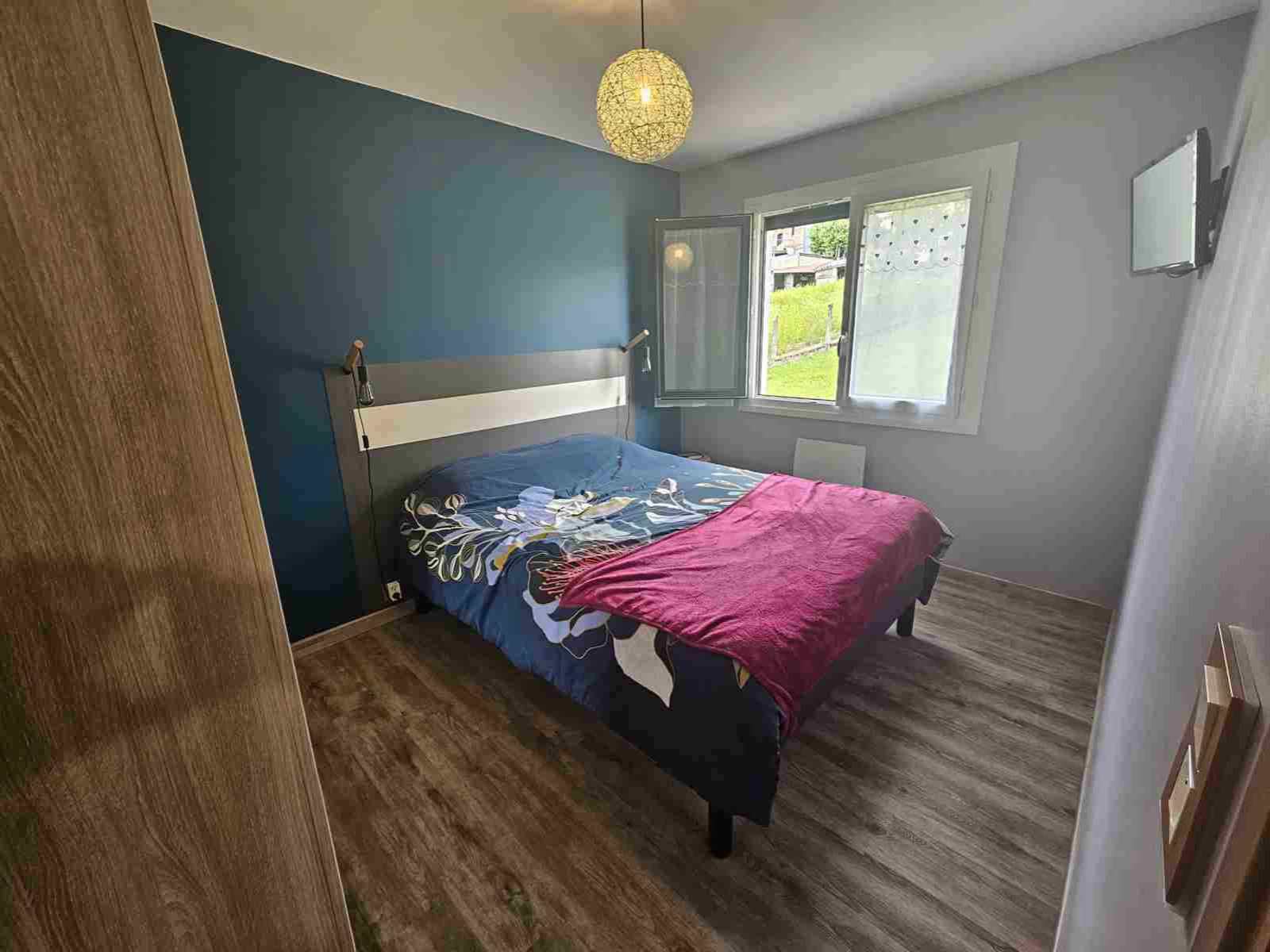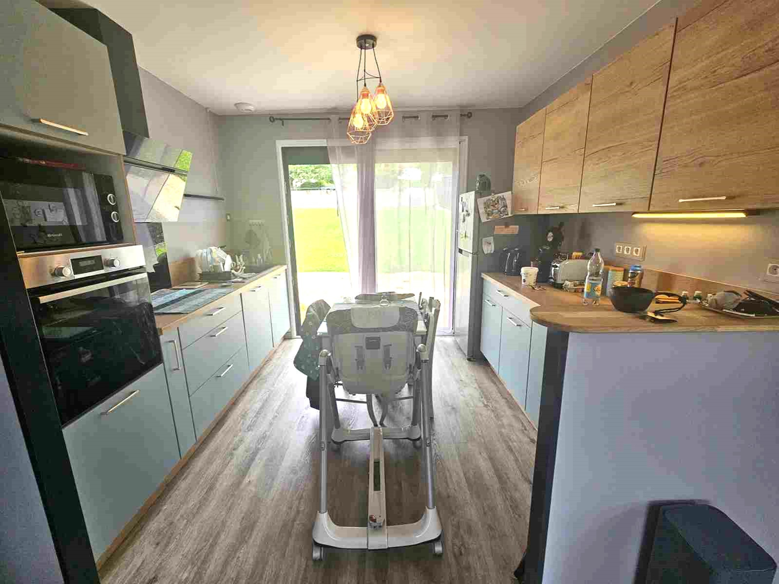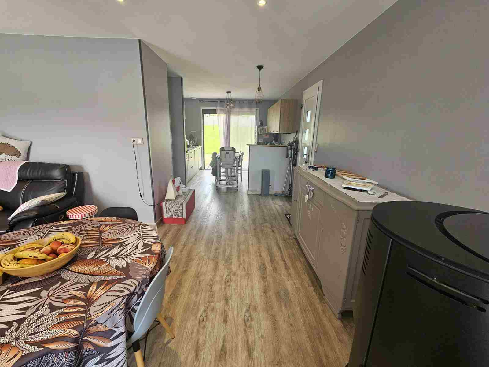 Cette maison de 1972 comprend en rez-de-chaussée un sous-sol composé d'une partie garage, atelier et une buanderie fermée. A l'étage, en rez-de-jardin, une entrée donnant sur un salon-salle à manger équipé d'un poêle à granulé de 2021 et d'une porte fenêtre donnant sur un balcon, une cuisine ouverte aménagée et équipée avec baie vitrée donnant sur terrasse et jardin arrière, un couloir desservant 2 belles chambres lumineuses, une salle d'eau et un WC suspendu.