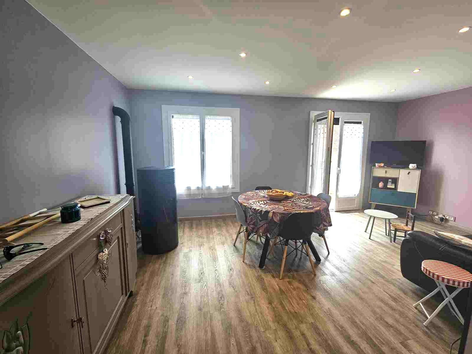 La couverture est en très bon état et n'est pas d'origine, électricité et plomberie refait, huisseries en triple vitrage de qualité équipées de stores solaires, raccordée en direct au tout à l'égout, fibre optique prêt à être raccordée. En plus du poêle à granulés, les chambres sont équipés de convecteurs intelligents, VMC double flux. Les murs extérieurs ont été isolés, bien que cela ne soit pas pris en compte sur le DPE en l'absence de facture.