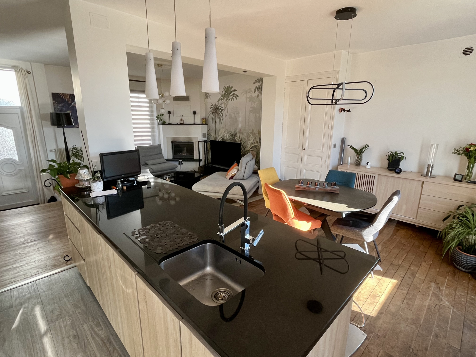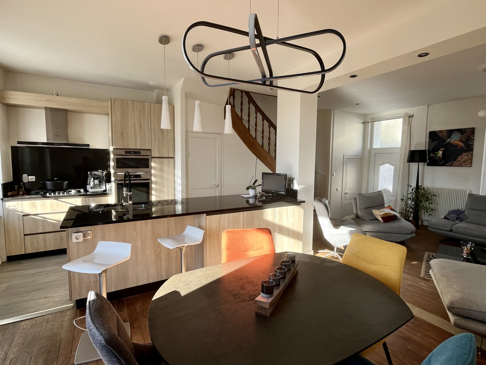 - Au rez-de-chaussée, une spacieuse pièce de vie de plus de 40 m2 agrémentée d'une cheminée, intégrant une cuisine moderne entièrement équipée. Cet espace convivial s'ouvre sur un agréable jardin clos, arboré et au calme. Un WC complète ce niveau.