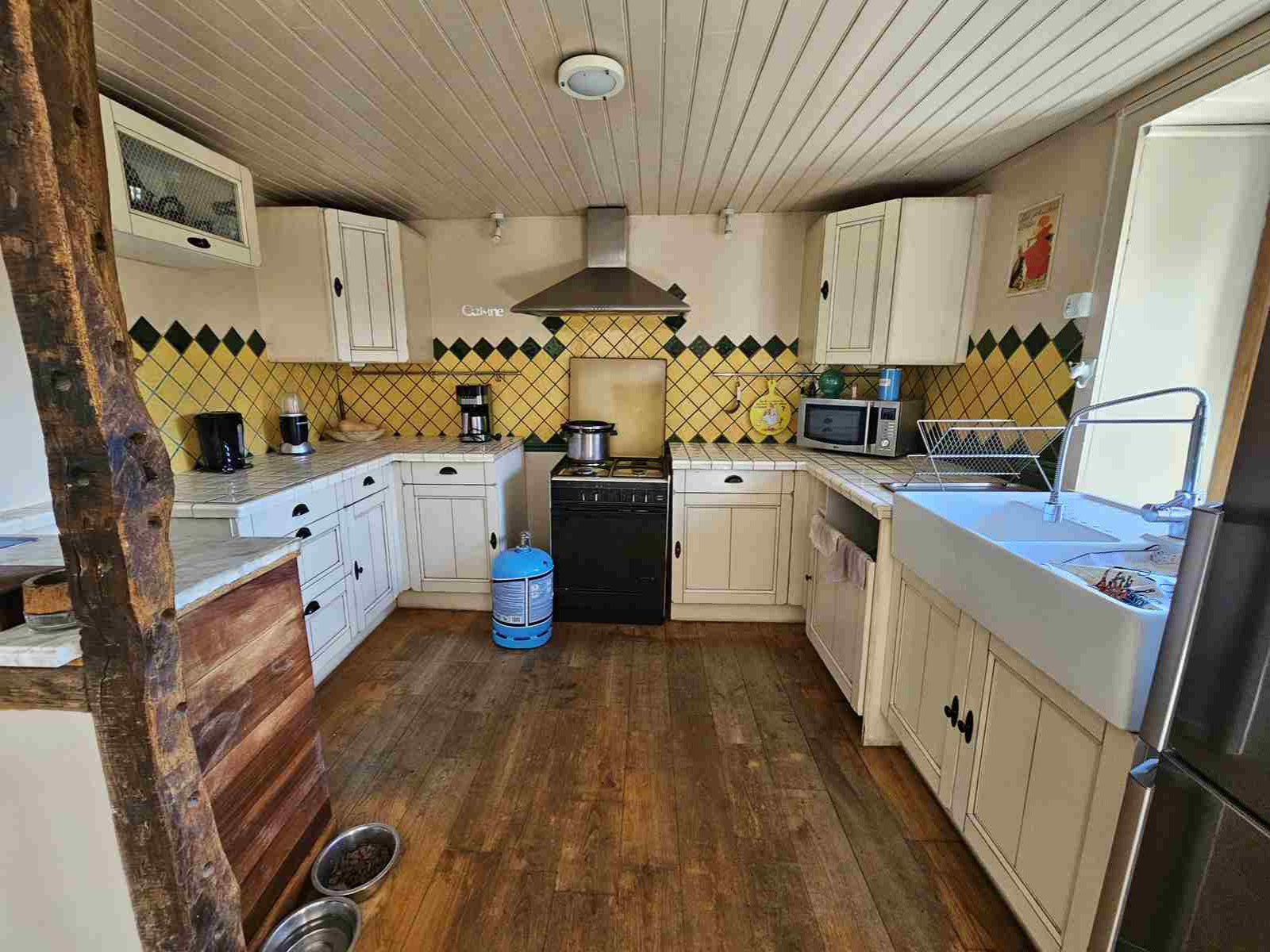 La partie agrandissement date de 2018. Elle est élevée sur une cave et un garage pouvant recevoir une voiture et comprend un salon avec une baie coulissante donnant sur l'extérieur, équipée d'un poêle à granulés de qualité, d'une chambre supplémentaire et d'une salle d'eau spacieuse et moderne.